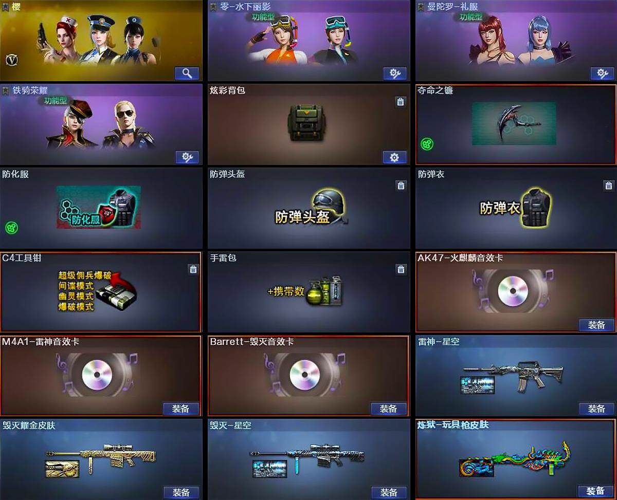 【道具】:炫彩背包,夺命之镰,防化服,防弹头盔,防弹衣,C4工具钳,手雷包
