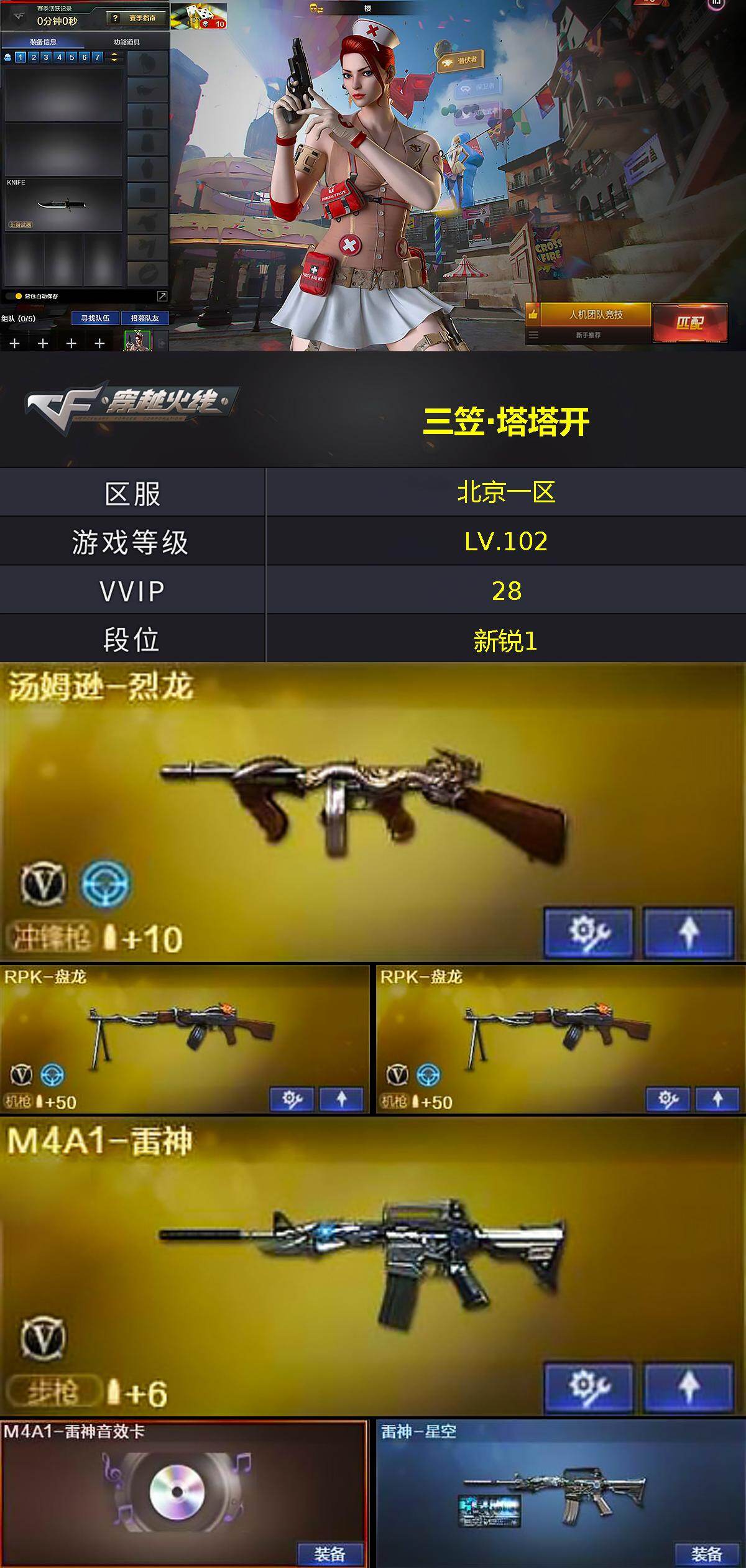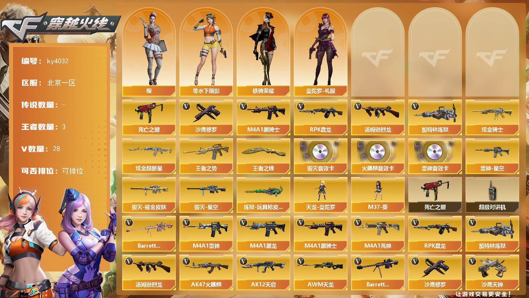 [14388061]北京一区-28V-3王者-2炫金 【热门武器】:死亡之眼*2,M4A1-黑骑士,汤姆逊-烈龙,RPK-盘龙*2,加特林-炼狱*2,沙鹰-修罗 【王者炫金武器】:王者之势,王者之锋*2,炫金骑士,炫金超新星 【音效卡】:AK47-火麒麟音效卡,M4A1-雷神音效卡,Barrett-毁灭音效卡 【皮肤】:雷神-星空,毁灭耀金皮肤,毁灭-星空,炼狱-玩具枪皮肤 【角色】:樱,零-水下丽影,曼陀罗-礼服,铁骑荣耀 【人偶武器】:天龙-曼陀罗,M37-葵 【暴走生化】:死亡之眼*2,超级对讲机 【英雄级武器】:AK47-火麒麟,M4A1-黑龙*2,M4A1-雷神,M4A1-黑骑士,M4A1-死神*2,AK12-天启,AK47-机械迷城,AK-47-猩红传说,AWM-天龙,Barrett-毁灭*2,Barrett-金色蔷薇,RPK-盘龙*2,加特林-炼狱*2,汤姆逊-烈龙,沙鹰-修罗,沙鹰-天神,龙啸,麒麟刺,高爆手雷-雷霆,闪光弹-雷霆,烟雾弹-雷霆 【道具】:炫彩背包,夺命之镰,防化服,防弹头盔,防弹衣,C4工具钳,手雷包 【特殊枪械】:1黑骑士,1烈龙,2盘龙,2炼狱