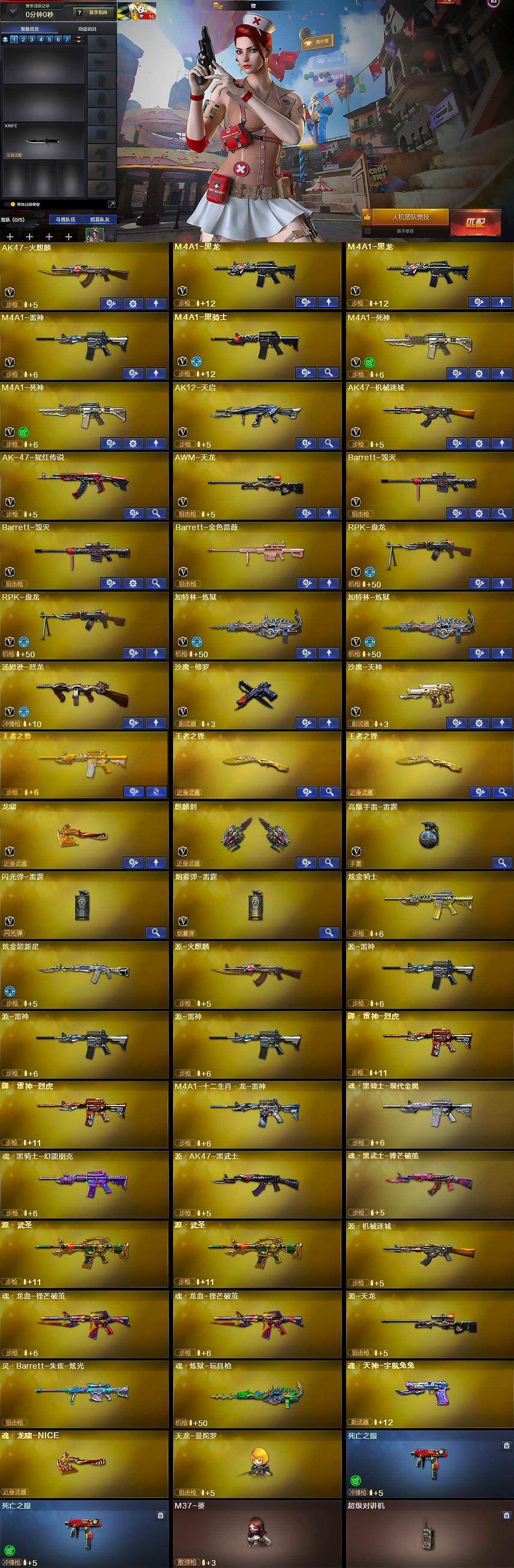 - PX_2096747-VIP4/47V/7王者/巴雷特-雷霆王者/审判者/AK47-火麒麟/AK47-血武士/M4A1-雷神/M4A1-死神/M4A1-铁胆虎魄/SCAR-探星者/QBZ03-玉面羞花/AWM-天龙/AWM-裁决/AWM-指南针/巴雷特-毁灭/巴雷特-雷霆王者/98K-黑骑士/刘易斯-血月/MK5-极光/汤姆逊-烈龙/CBJ-MS-毒蜂/地狱火/AA12-火药/USP-神罚/USP