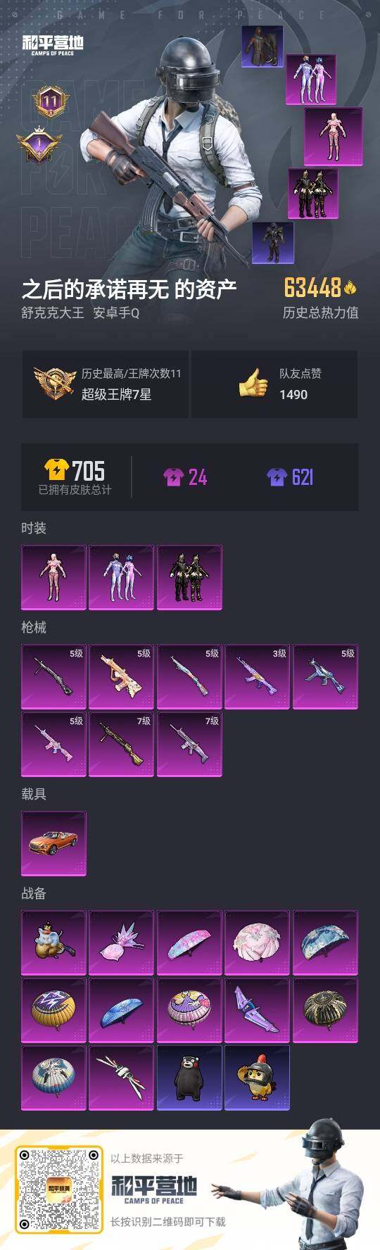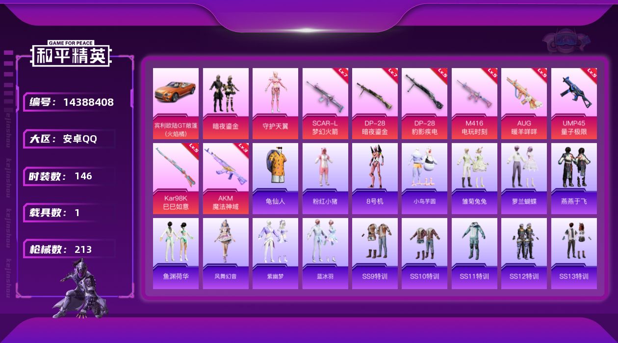 - [15178363]素材身法号/无敌战神框1/绝世印记1【特价急出/详情看图】:苹果 手Q-无敌战神框-7粉装-16特效枪-1载具-3粉色飞行器-8.8w热力值-13王牌印记-212套装-315枪皮【热门品类】:粉装-怪诞乔克,粉装-梦幻火箭,套装-寒蝎幽灵,套装-浪漫天命,套装-都市猎人,套装-派对舞王,角色-军刀雅典娜,套装-龟仙人,角色-Mark.06,小丑红鼻头【粉色载具】:星梦玉骢【粉色套装】:粉装-怪诞乔克,粉装-梦幻火箭,粉装-放客神游,角色-洛天依,角色-复仇流浪者,粉装-动力核心,角色-狂魅哈莉【粉色枪皮等级】:AKM-梦之光华(五级),SCAR-L-锦绣绵绵(五级),M416-心之恋语(五级),GROZA-镜光银凌(五级),AUG-许七安(五级),AUG-暖羊咩咩(五级),M762-青锋波束(五级),UMP45-量子极限(五级),Vector-环太平洋(五级),AKS-74U-信仰神谕(五级),Kar98K-巳巳如意(五级),Mk14-精灵梦叶罗丽(五级),AMR-鸢尾晶梦(五级),DP-28-豹影疾电(五级),MG3-洛神天依(五级),破片手榴弹-瓶中星球(七级)【粉色飞行器】:焦糖拿铁飞行器,黄族统领飞行器
