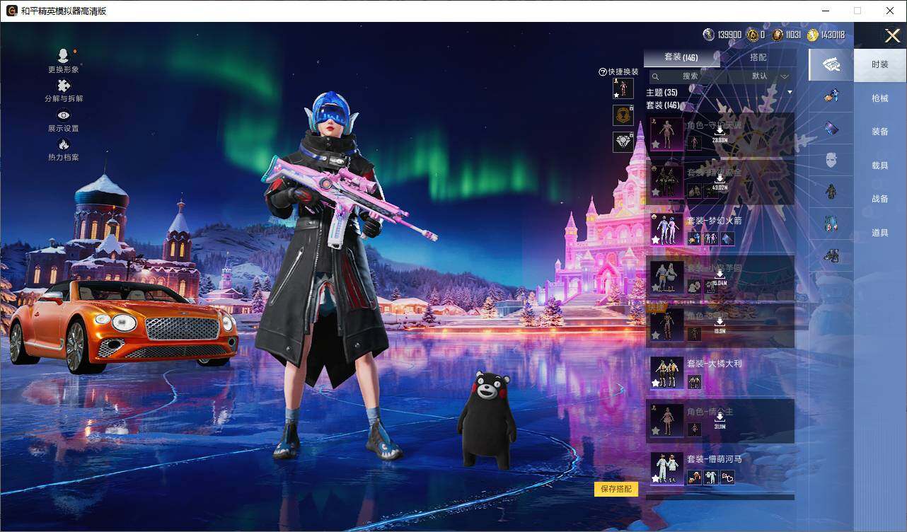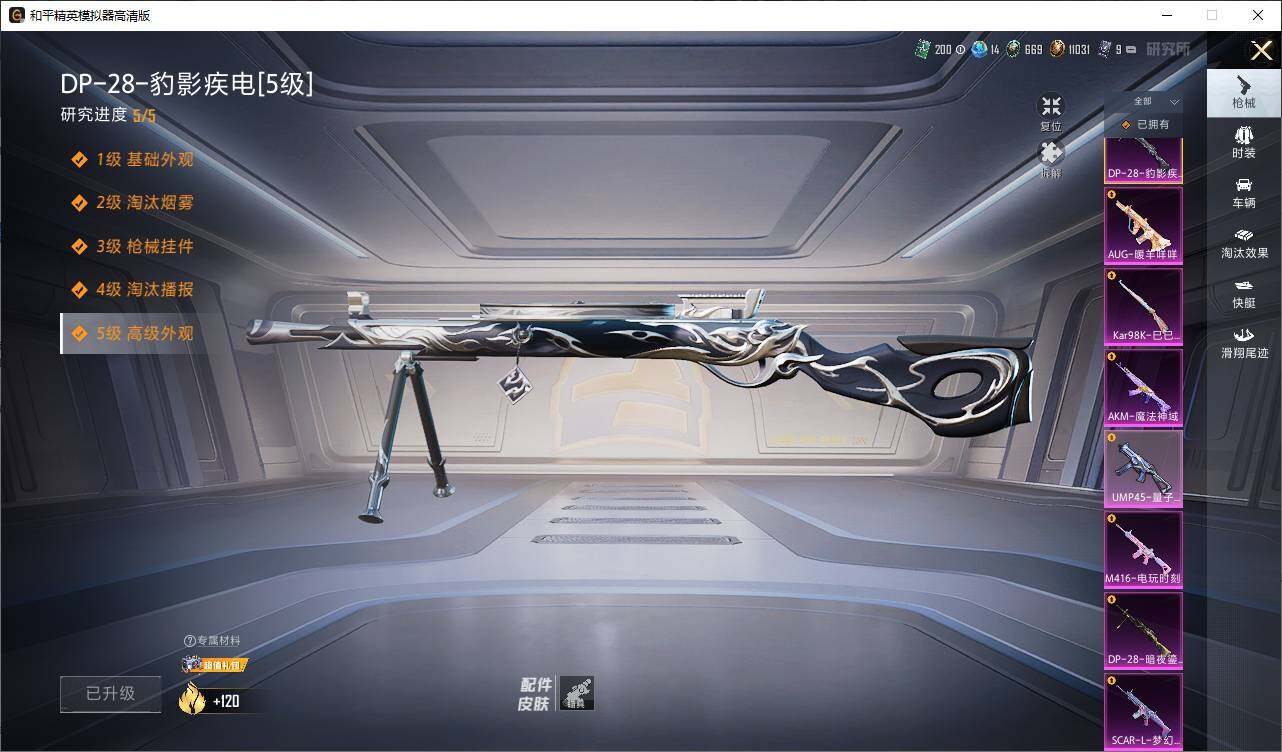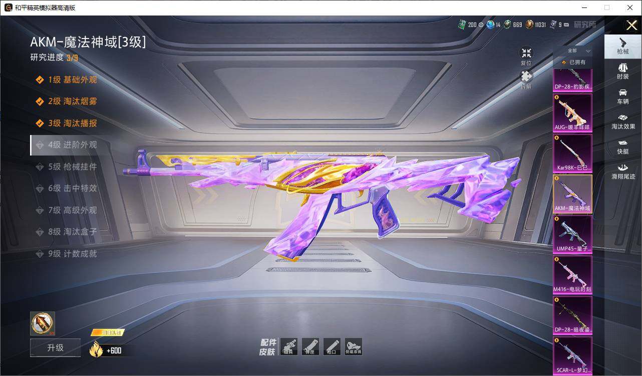 AKM-魔法神域,SCAR-L-梦幻火箭,M416-电玩时刻,AUG-暖羊咩咩,UMP45-量子极限,Kar98K-巳巳如意,DP-28-暗夜鎏金