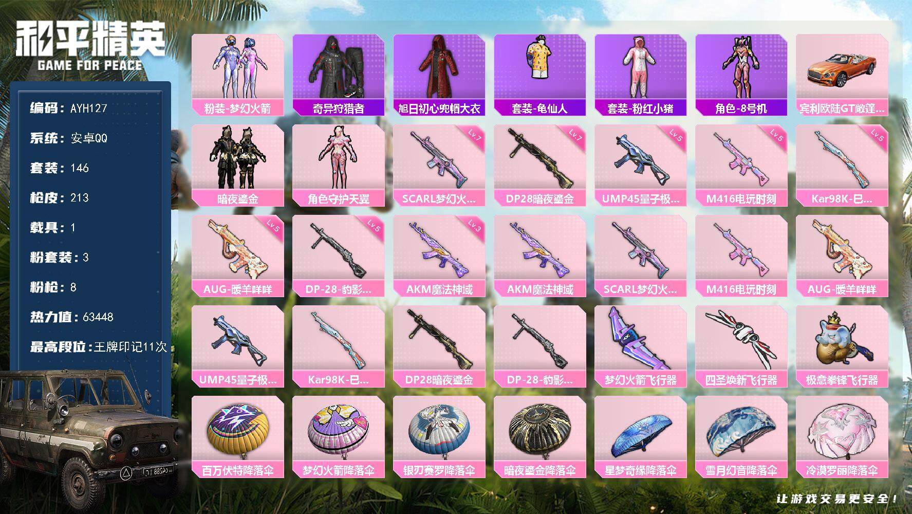 [14388408]地铁满天赋【店主推荐捡漏号!可直接换绑】安卓 手Q-3粉装-8特效枪-1载具-4粉色飞行器-63448热力值-11王牌印记-146套装-213枪皮【热门品类】:粉装-梦幻火箭,套装-奇异狩猎者,旭日初心兜帽大衣,套装-龟仙人,套装-粉红小猪,角色-8号机【粉色载具】:宾利欧陆GT敞篷(火焰橘)【粉色套装】:粉装-梦幻火箭,粉装-暗夜鎏金,角色-守护天翼【粉色枪皮等级】:AKM-魔法神域(三级),SCAR-L-梦幻火箭(七级),M416-电玩时刻(五级),AUG-暖羊咩咩(五级),UMP45-量子极限(五级),Kar98K-巳巳如意(五级),DP-28-暗夜鎏金(七级),DP-28-豹影疾电(五级)【粉色枪皮】:AKM-魔法神域,SCAR-L-梦幻火箭,M416-电玩时刻,AUG-暖羊咩咩,UMP45-量子极限,Kar98K-巳巳如意,DP-28-暗夜鎏金,DP-28-豹影疾电【粉色飞行器】:梦幻火箭飞行器,四圣焕新飞行器,极意拳锋飞行器