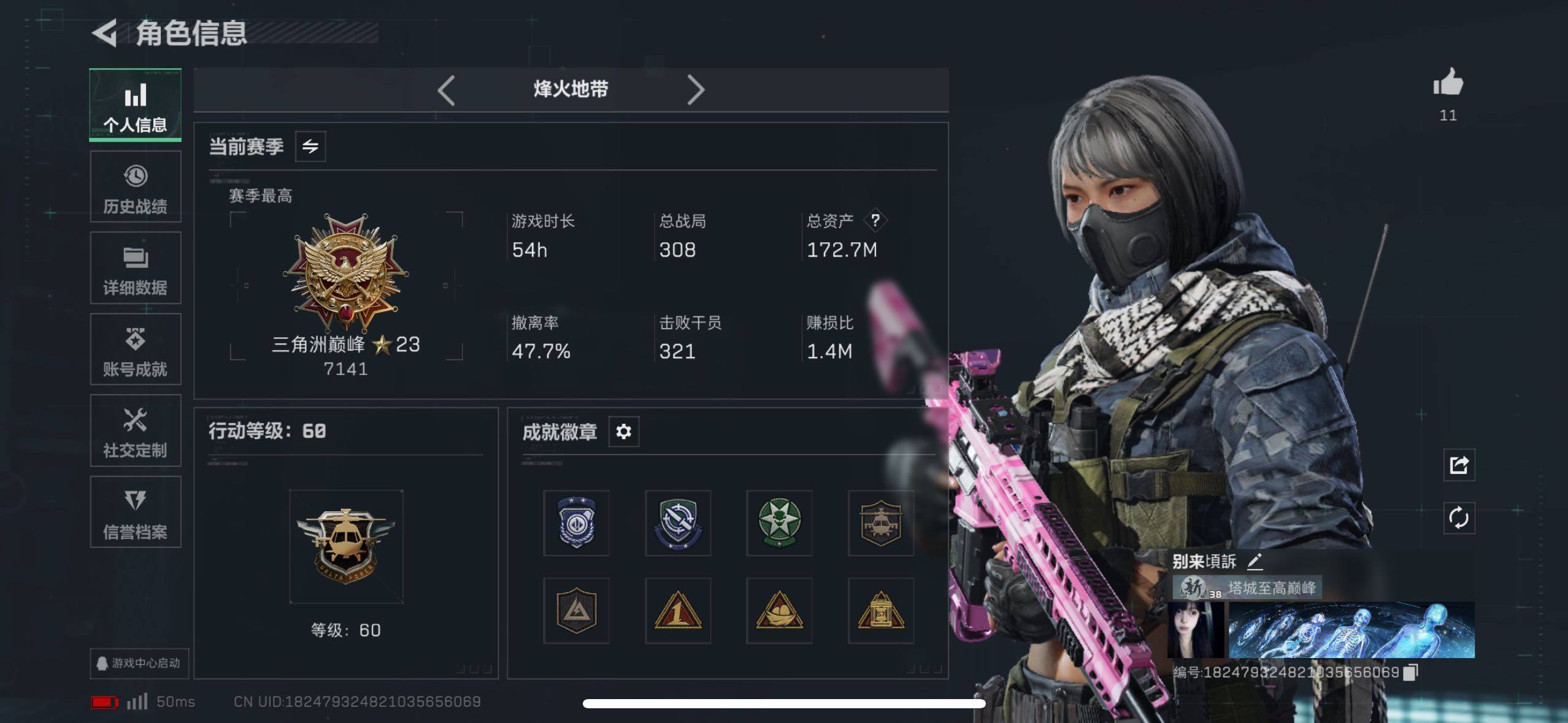 - [10919728]总资产163m 纯币98m+s4赛季3x3安全箱+饰金玫瑰红狼全套+s3s4赛季通行证+烽火等级60 特勤部门等级高 永久包赔