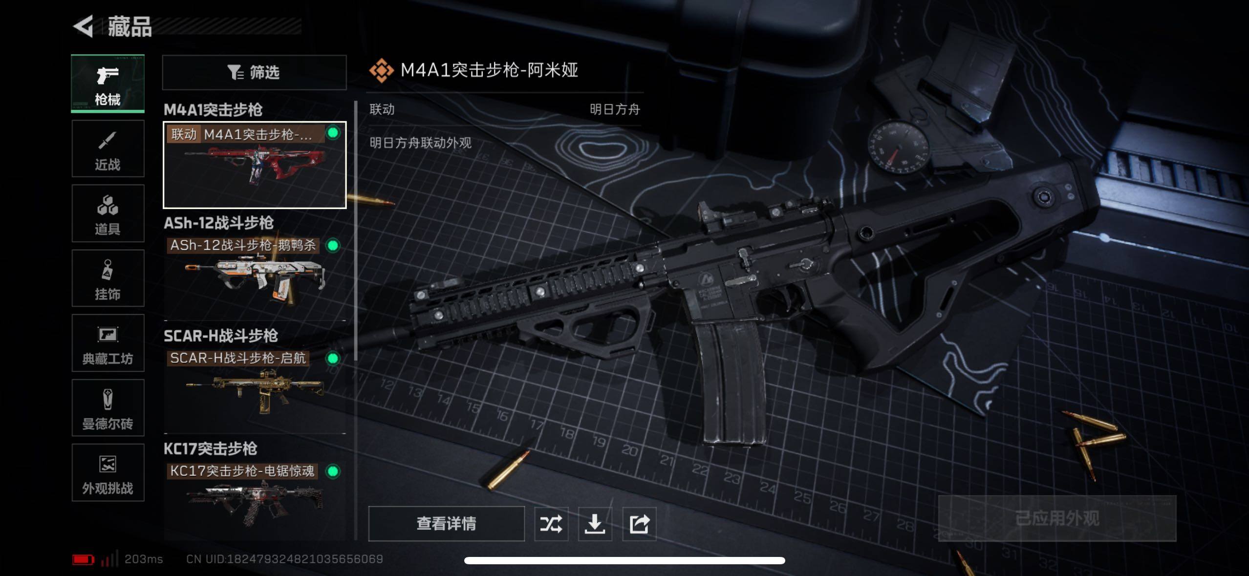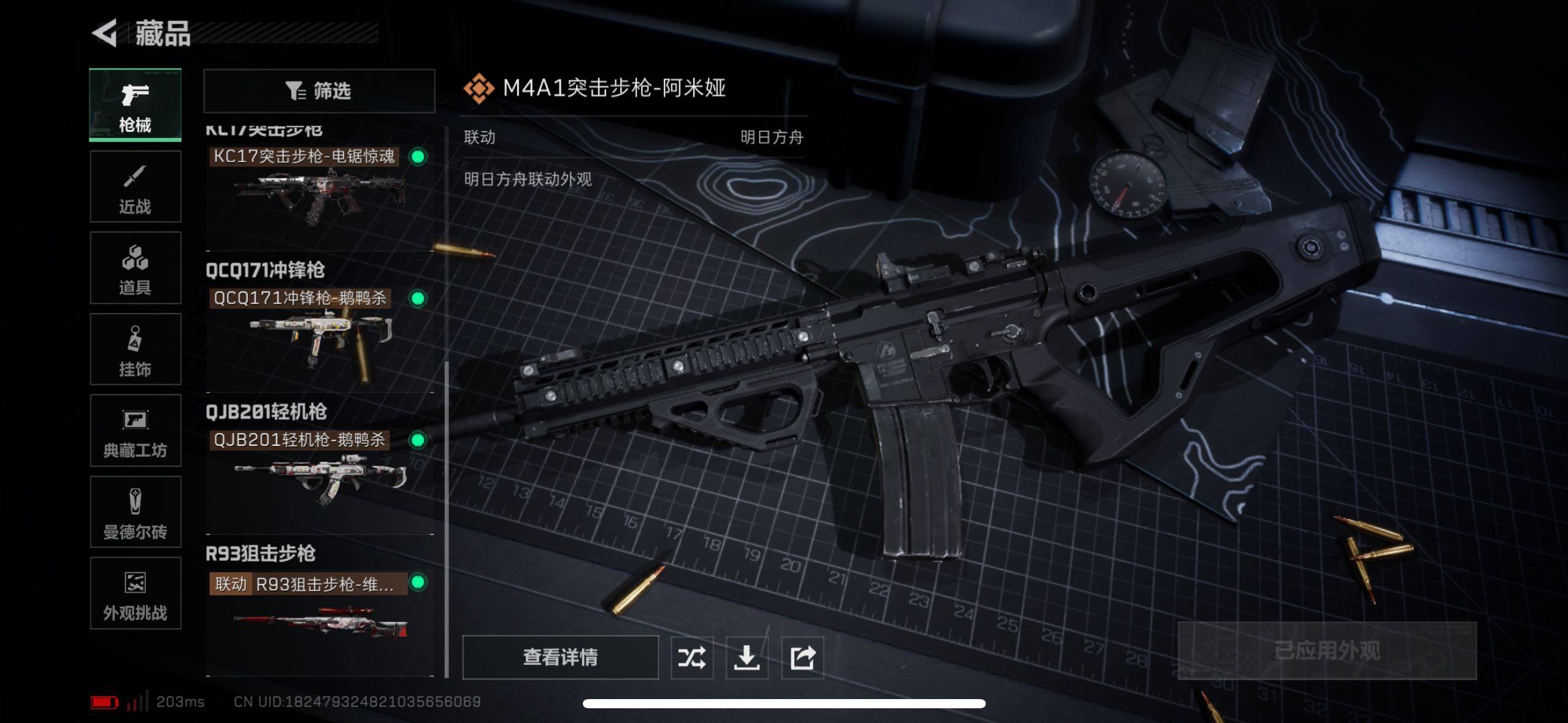 【传说外观】:M4A1突击步枪-阿米娅,ASh-12战斗步枪-鹅鸭杀,SCAR-H战斗步枪-启航,KC17突击步枪-电锯惊魂,QCQ171冲锋枪-鹅鸭杀,QJB201轻机枪-鹅鸭杀,R93狙击步枪-维什戴尔