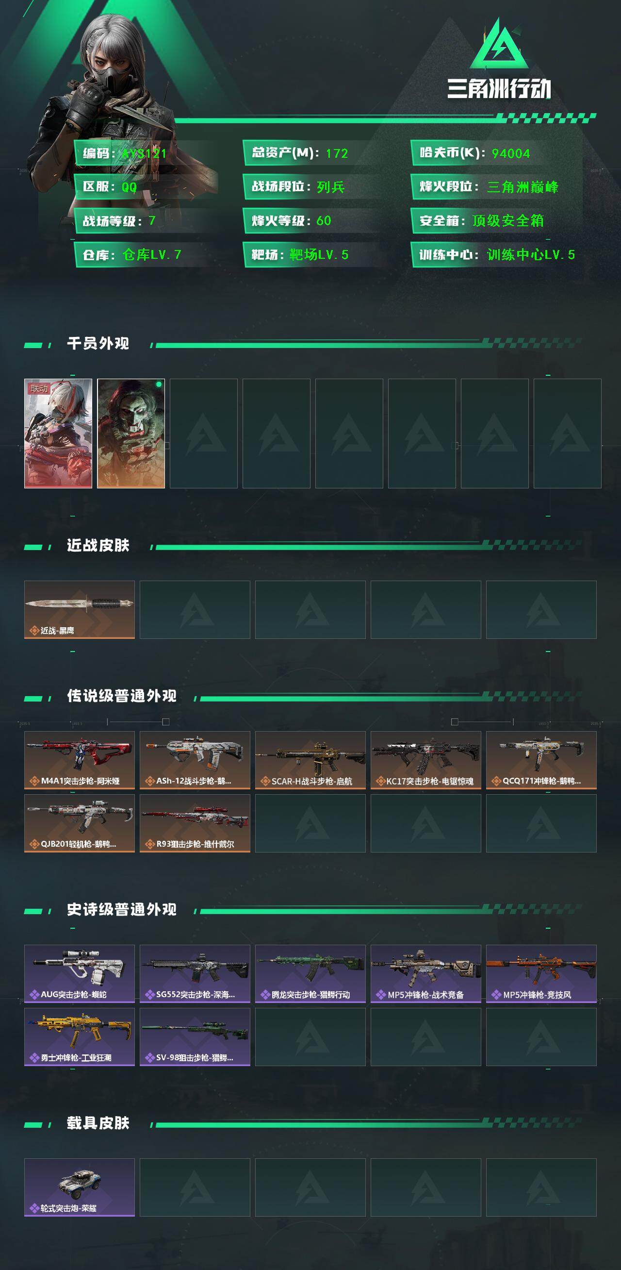 [14388474]【店主推荐可二次】94004k哈伏币-149m流动资产-60烽火等级-三角洲巅峰-7战场等级-列兵 【干员外观】:骇爪-维什戴尔,红狼-电锯惊魂 【近战皮肤】:近战-黑鹰 【传说外观】:M4A1突击步枪-阿米娅,ASh-12战斗步枪-鹅鸭杀,SCAR-H战斗步枪-启航,KC17突击步枪-电锯惊魂,QCQ171冲锋枪-鹅鸭杀,QJB201轻机枪-鹅鸭杀,R93狙击步枪-维什戴尔 【史诗外观】:AUG突击步枪-蝮蛇,SG552突击步枪-深海恐惧,腾龙突击步枪-猎鳄行动,MP5冲锋枪-战术竞备,MP5冲锋枪-竞技风,勇士冲锋枪-工业狂潮,SV-98狙击步枪-猎鳄行动 【稀有外观】:AKM突击步枪-肃杀,QBZ95-1突击步枪-公平竞技,M7战斗步枪-捣蛋鬼,SCAR-H战斗步枪-荣耀列队,腾龙突击步枪-冰天雪地,MP5冲锋枪-弄臣,MP5冲锋枪-哈夫克卫队,P90冲锋枪-黄昏,P90冲锋枪-捣蛋鬼,UZI冲锋枪-亚特兰蒂斯,SMG-45-行动开启,SMG-45冲锋枪-幻影结构,勇士冲锋枪-冰天雪地,M1014霰弹枪-幻影结构,QJB201轻机枪-哈夫克卫队,SKS射手步枪-弄臣,SR-25射手步枪-开拓 【普通外观】:M4A1突击步枪-粉色涂装,M4A1突击步枪-高雅黑,M4A1突击步枪-海色,QBZ95-1突击步枪-高雅黑,QBZ95-1突击步枪-海浪,QBZ95-1突击步枪-海色,QBZ191突击步枪-三角洲力量,M16A4突击步枪-高雅黑,AUG突击步枪-浅蓝涂装,M7战斗步枪-红色涂装,SG552突击步枪-浅蓝涂装,SG552突击步枪-海浪,G3战斗步枪-高雅黑,PTR-32突击步枪-黄蜂,MP5冲锋枪-海色,MP5冲锋枪-黄蜂,Vector冲锋枪-几何迷彩,UZI冲锋枪-海色,野牛冲锋枪-高雅黑,QCQ171冲锋枪-三角洲力量,M1014霰弹枪-高雅黑,M249轻机枪-黄蜂,M250通用机枪-条纹,SVD狙击步枪-高雅黑,SR-25射手步枪-黄蜂,QSZ92G-条纹,沙漠之鹰-海浪,沙漠之鹰-高雅黑,93R-三角洲力量 【载具外观】:轮式突击炮-荣耀 【军牌】:军牌-装备修理,军牌-永恒,军牌-信誉优秀 【挂饰】:挂饰-维什戴尔,挂饰-诡影狙击兵,挂饰-诡影喷火兵,挂饰-崩岩重炮*2,挂饰-启程