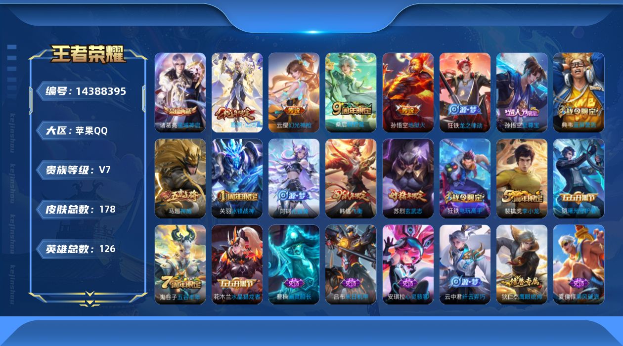 [14388395]可二次【店主推荐捡漏号!可直接换绑】苹果Q-V7-至尊星耀V段位-126英雄-178皮肤-1典藏皮肤-4传说-46史诗