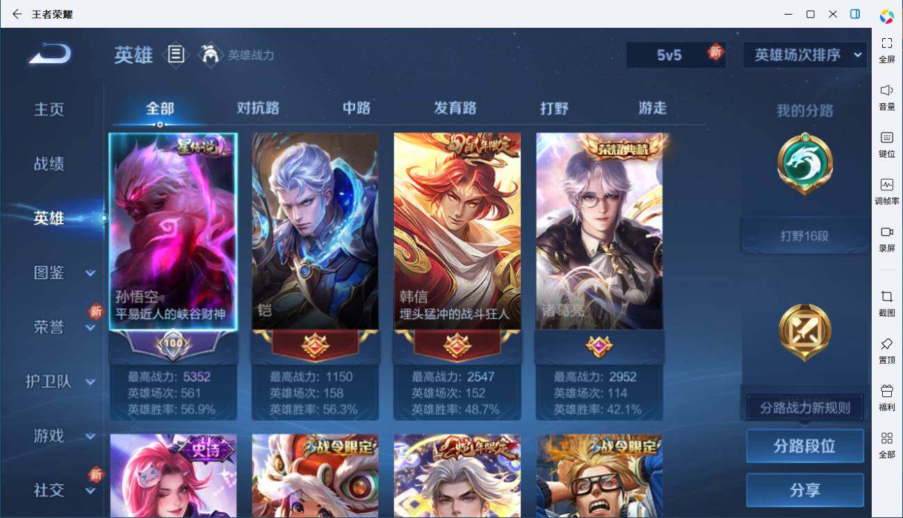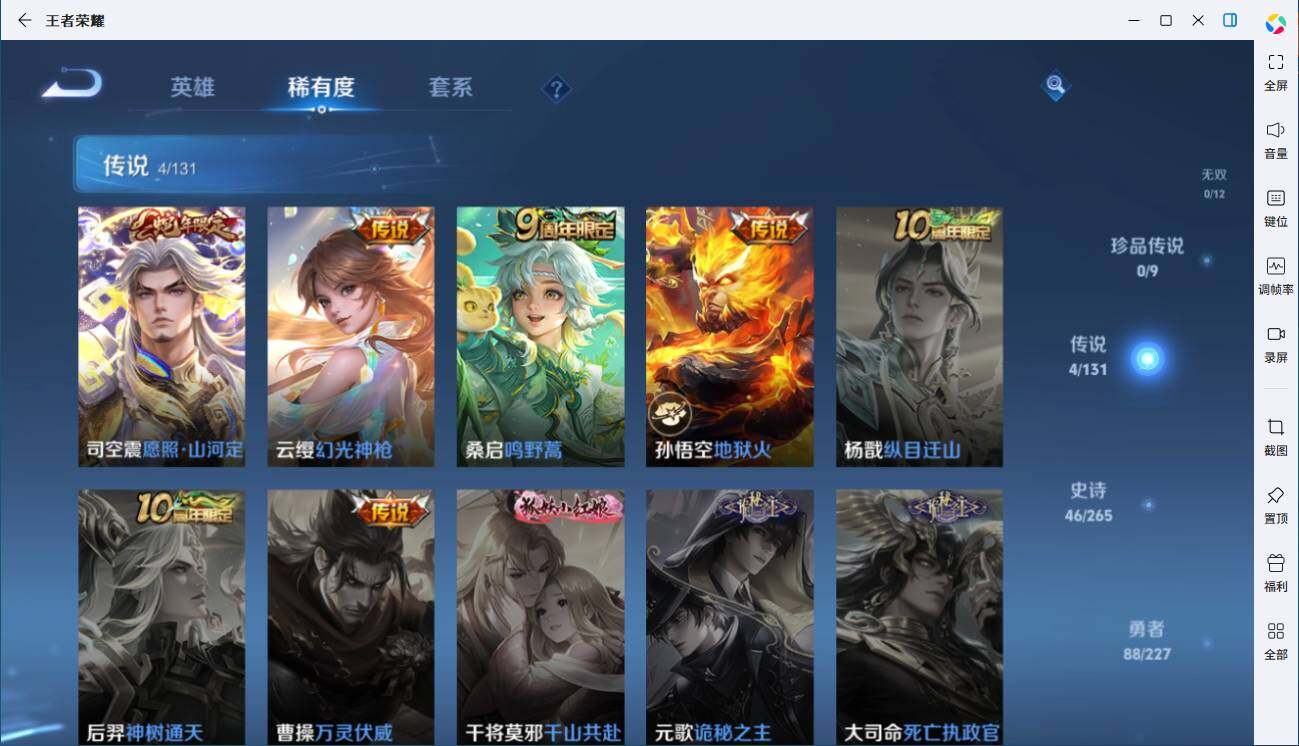 - PX_2093845-实名: 可修改 贵族等级: V7 英雄数: 122 皮肤数: 198 传说皮: 炽阳神光,乘龙·问璇玑 限定皮: 梁祝,匿光决锋者,五谷丰年,山海·玄木吟,齐天大圣,鸣野蒿,愿照·千秋盛