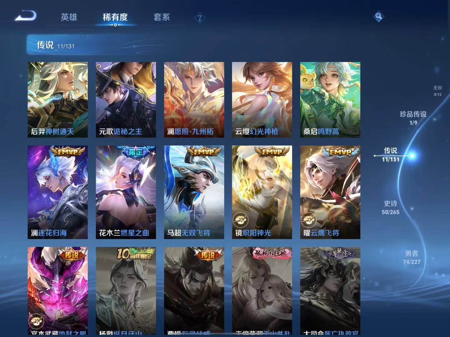 【传说皮肤】:后羿神树通天,元歌诡秘之主,澜愿照九州拓,云缨幻光神枪,桑启鸣野蒿,澜逐花归海,花木兰燃星之曲,马超无双飞将,镜炽阳神光,曜云鹰飞将,宫本武藏地狱之眼