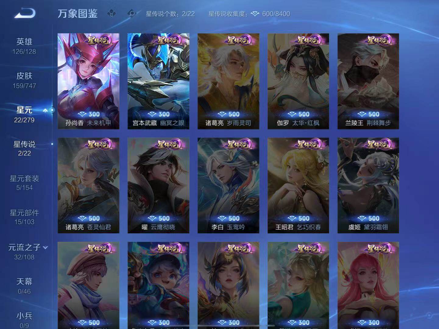 【史诗皮肤】:露娜紫霞仙子,赵云皇家上将,貂蝉圣诞恋歌,甄姬冰雪圆舞曲,狄仁杰魔术师,宫本武藏鬼剑武藏,孙尚香水果甜心,妲己魅力维加斯,吕布末日机甲,张飞乱世虎臣,赵云引擎之心,花木兰水晶猎龙者,夏侯惇乘风破浪,兰陵王暗隐猎兽者,亚瑟心灵战警,雅典娜冰冠公主,百里守约特工魅影,铠曙光守护者,蔡文姬舞动绿茵,刘禅天才门将,程咬金功夫厨神,孙策猫狗日记,狄仁杰鹰眼统帅,娜可露露晚萤,嫦娥如梦令,瑶遇见神鹿,百里玄策原初追逐者,裴擒虎李小龙,吕布御风骁将,米莱狄胡桃异想国,嫦娥拒霜思,雅典娜黎明之约,鬼谷子五谷丰年,梦奇顽趣,暃星界游侠,马可波罗山海玄木吟,刘禅电玩爆裂旋风,镜真我赫兹,司空震地狱燃心,阿古朵江河有灵,蒙犽百解令,蒙恬荣光圣徽,暃埋骨钱,马可波罗星界特工,李白谪仙醉月,牛魔星界战将,弈星万物之道,黄忠百相守梦,公孙离涂山容容,莱西奥光弋星穹