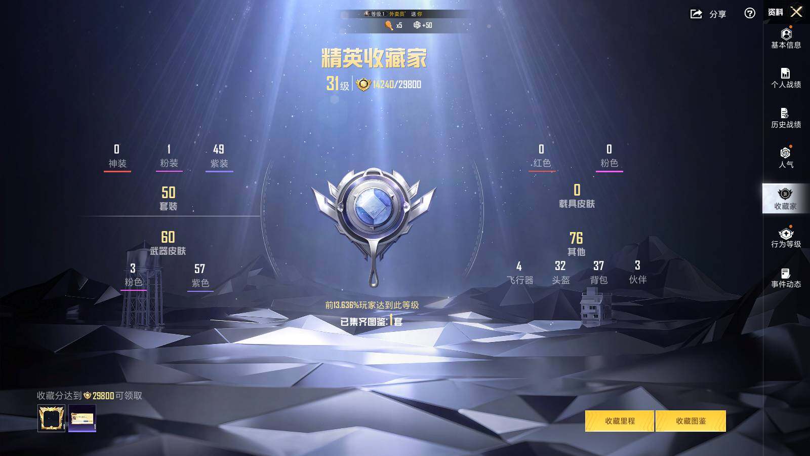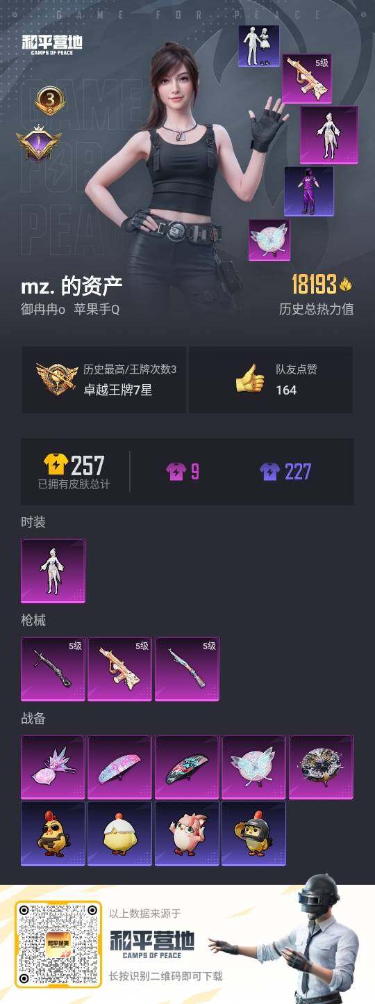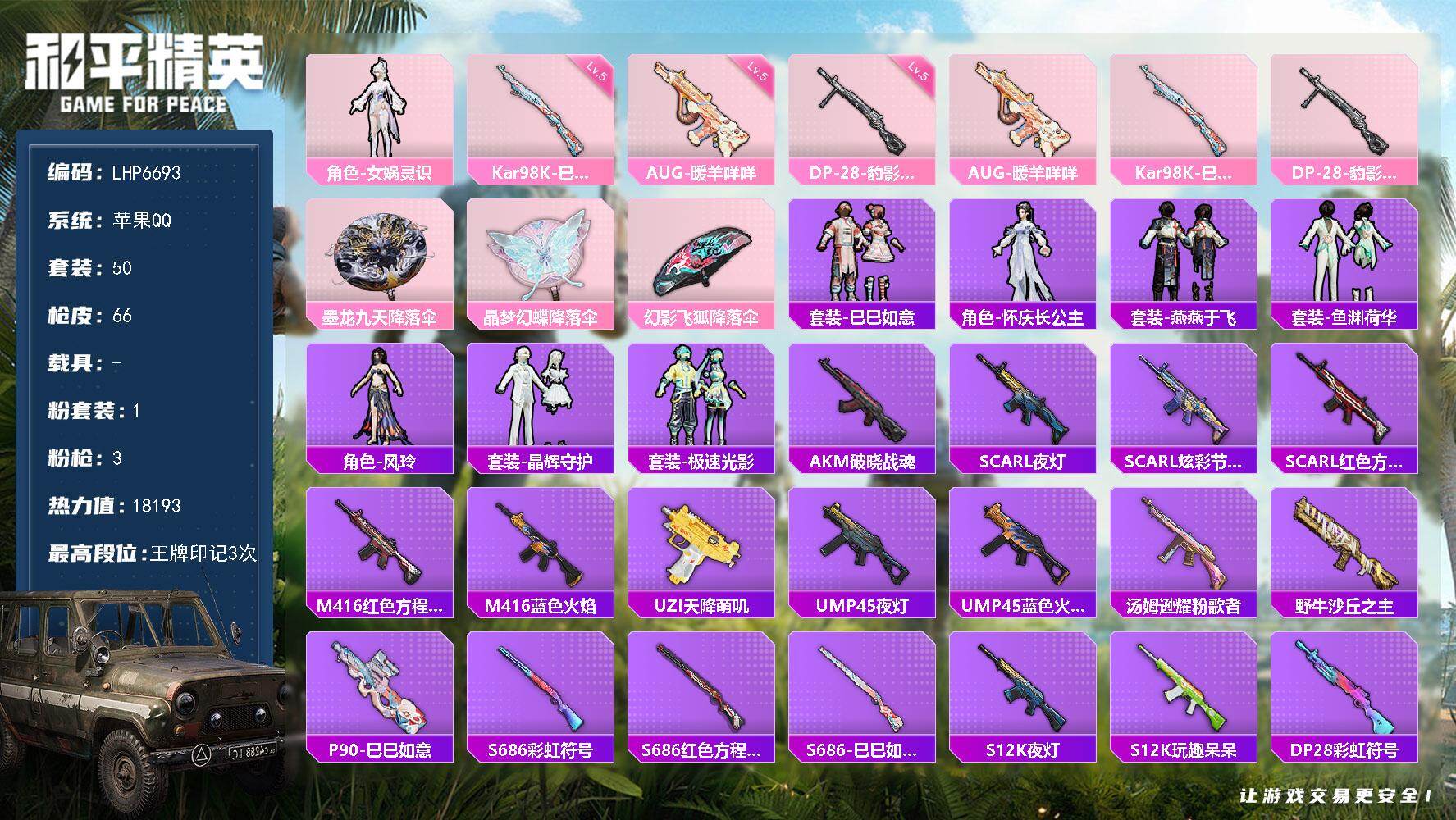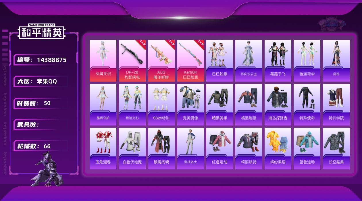 [14388875]可二次【店主推荐捡漏号!可直接换绑】/地铁满天赋 苹果 手Q-1粉装-3特效枪-1粉色飞行器-1.8w热力值-3王牌印记-50套装-66枪皮【粉色套装】:角色-女娲灵识【粉色枪皮等级】:AUG-暖羊咩咩(五级),Kar98K-巳巳如意(五级),DP-28-豹影疾电(五级)