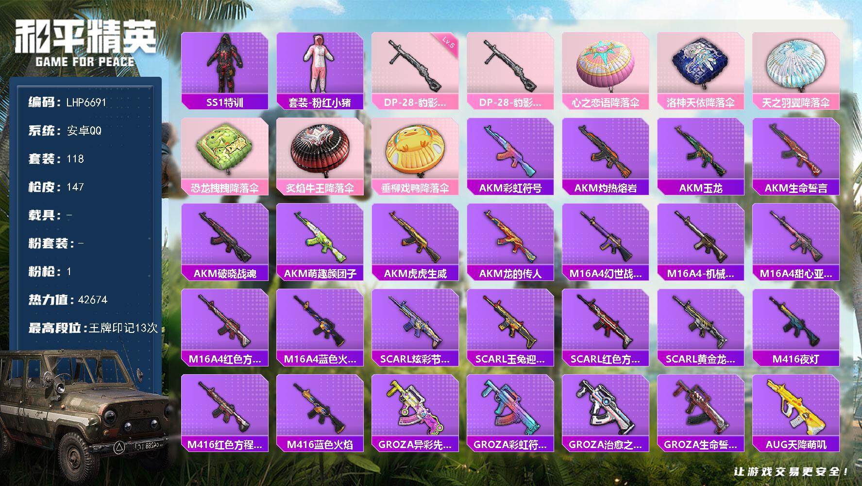 [14388914]可二次【店主推荐捡漏号!可直接换绑】 安卓 手Q-1特效枪-4.2w热力值-13王牌印记-118套装-147枪皮【热门品类】:套装-SS1特训,套装-粉红小猪【粉色枪皮等级】:DP-28-豹影疾电(五级)
