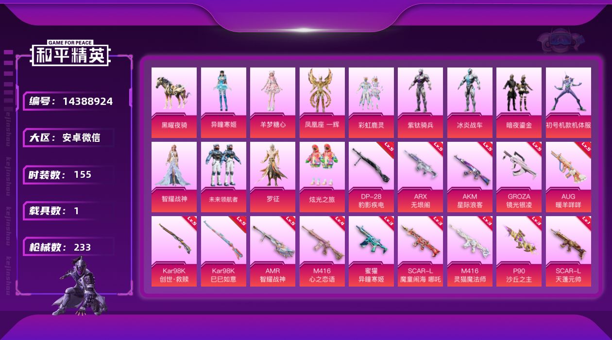 [14388924]素材身法号/地铁满天赋 安卓 微信-12粉装-14特效枪-1载具-5粉色飞行器-7.6w热力值-15王牌印记-155套装-233枪皮【热门品类】:套装-都市猎人,套装-暗夜行者,套装-动感兔斯基人偶服,角色-2P战斗服款,套装-龟仙人,套装-暗影哥特,套装-粉红小猪,角色-六号稻草人【粉色载具】:黑曜夜骑【粉色套装】:粉装-彩虹鹿灵,角色-初号机款机体服,粉装-暗夜鎏金,粉装-炫光之旅,角色-冰炎战车,角色-紫钛骑兵,粉装-未来领航者,角色-智耀战神,角色-凤凰座 一辉,角色-罗征,角色-羊梦糖心,角色-异瞳寒姬【粉色枪皮等级】:AKM-星际浪客(五级),SCAR-L-天蓬元帅(一级),SCAR-L-魔童闹海 哪吒(三级),M416-心之恋语(四级),M416-灵猫魔法师(三级),GROZA-镜光银凌(五级),AUG-暖羊咩咩(五级),蜜獾-异瞳寒姬(三级),ARX-无垠阁(五级),P90-沙丘之主(三级),Kar98K-创世·救赎(五级),Kar98K-巳巳如意(五级),AMR-智耀战神(五级),DP-28-豹影疾电(五级)【粉色飞行器】:英伦信使飞行器,圣域金龙飞行器,灵猫魔法师飞行器,飞天猪飞行器