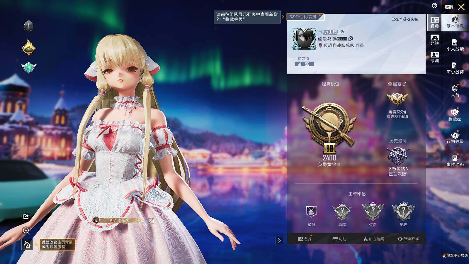 - 苹果QQ 可二次 当前段位不朽星钻Ⅴ 历史最高段位传奇王牌13星 热力值95051 等级67 套装189 王牌次数7 点券10 外观套装18 枪械皮肤19 热门紫装10 载具3 飞行器4 稀有0 头盔1 背包3