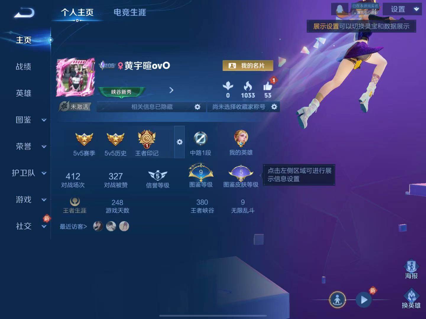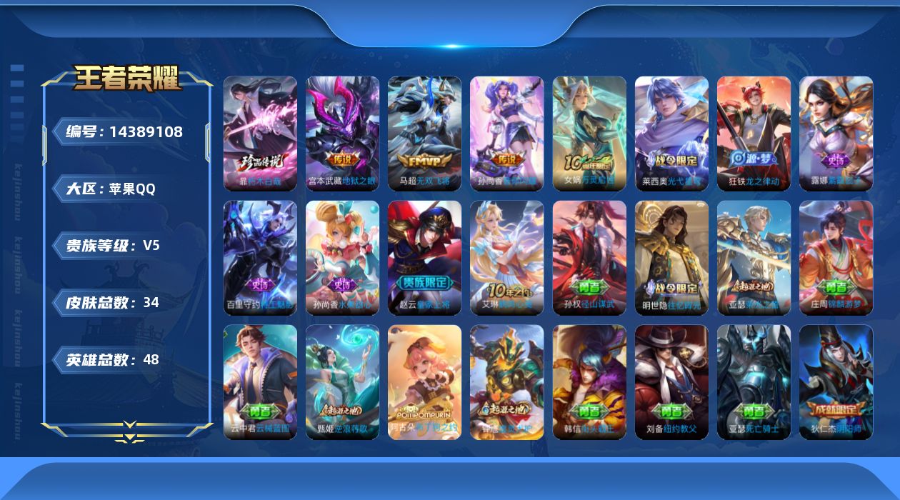 - PX_2096866-实名: 可修改 贵族等级: V7 英雄数: 122 皮肤数: 242 传说皮: 黄金射手座,挚爱之约,神器·狴犴令,山海·炽霜斩,燃星之曲,浮生妄,幻光神枪 限定皮: 李小龙,奔雷神使,梁祝,龙胆,寅虎·御盾,武陵仙君,高山流水,猪悟能,时之祈愿-云中君,时之祈愿-瑶,百木心枪,玉兔公主,匿光决锋者,深海之息,五谷丰年,鸣野蒿,逐霄战戟,愿照·山河定