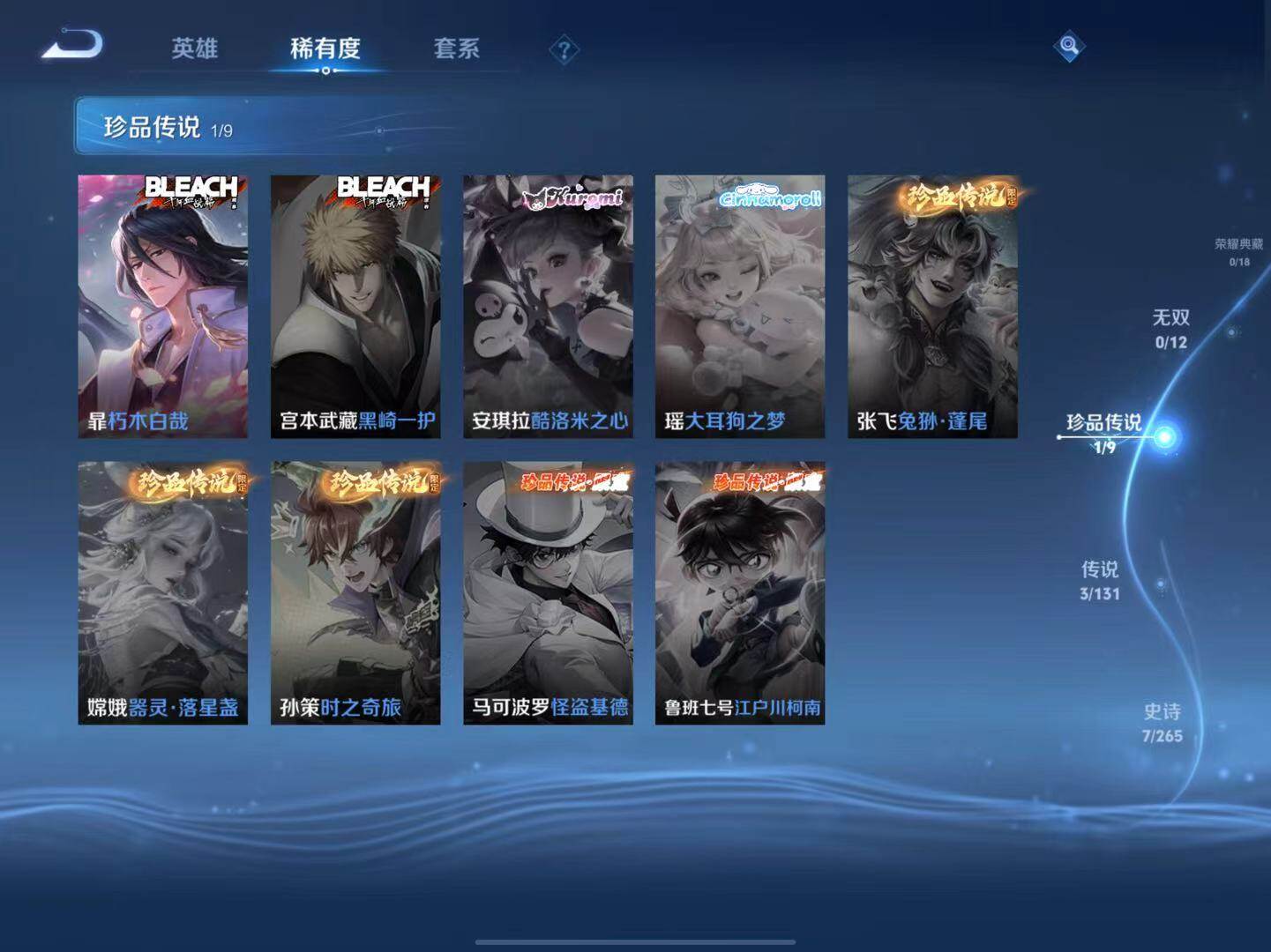 【史诗皮肤】:露娜紫霞仙子,赵云皇家上将,孙尚香水果甜心,百里守约特工魅影,狂铁龙之律动,莱西奥光弋星穹,女娲万灵启世
