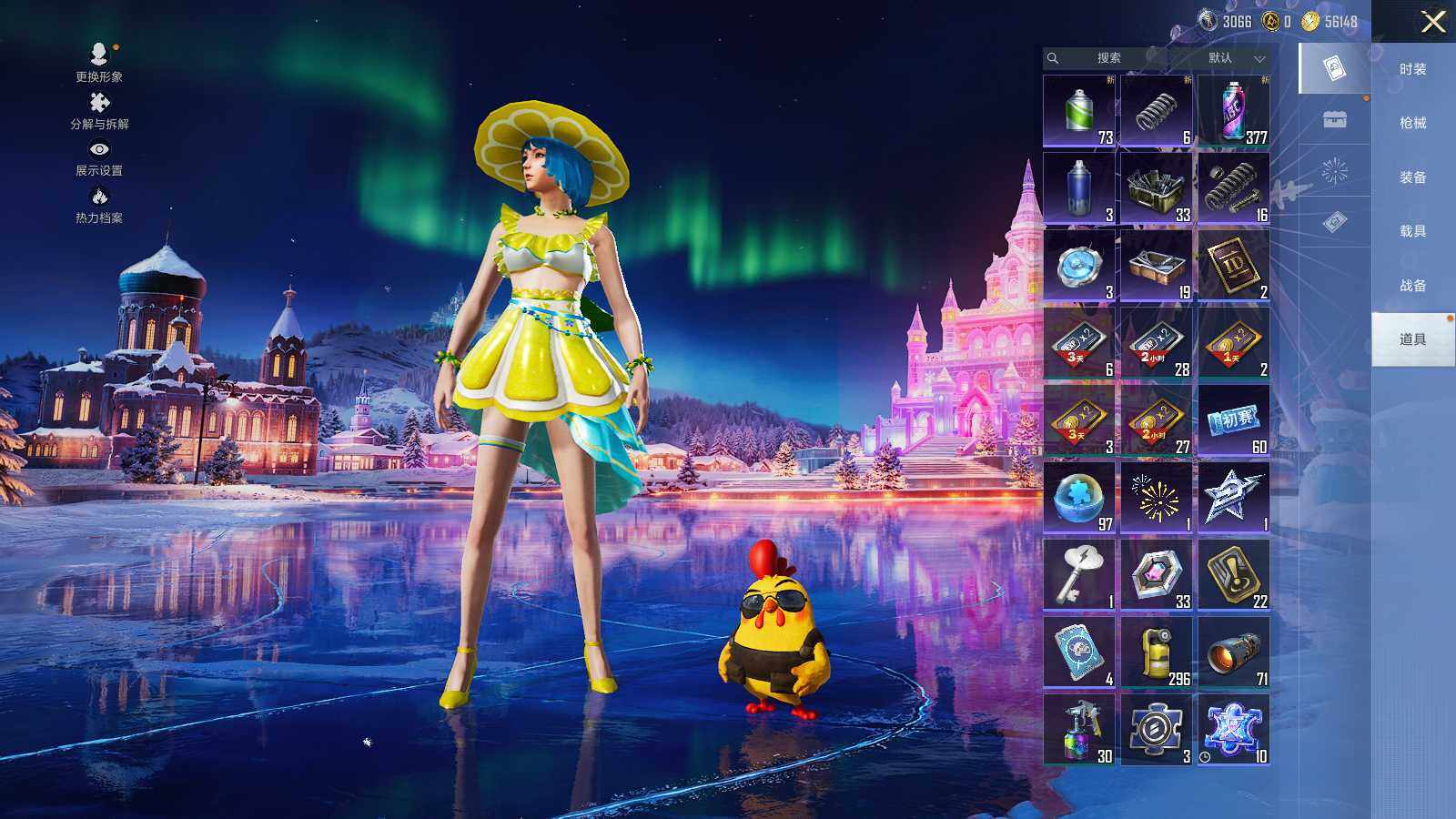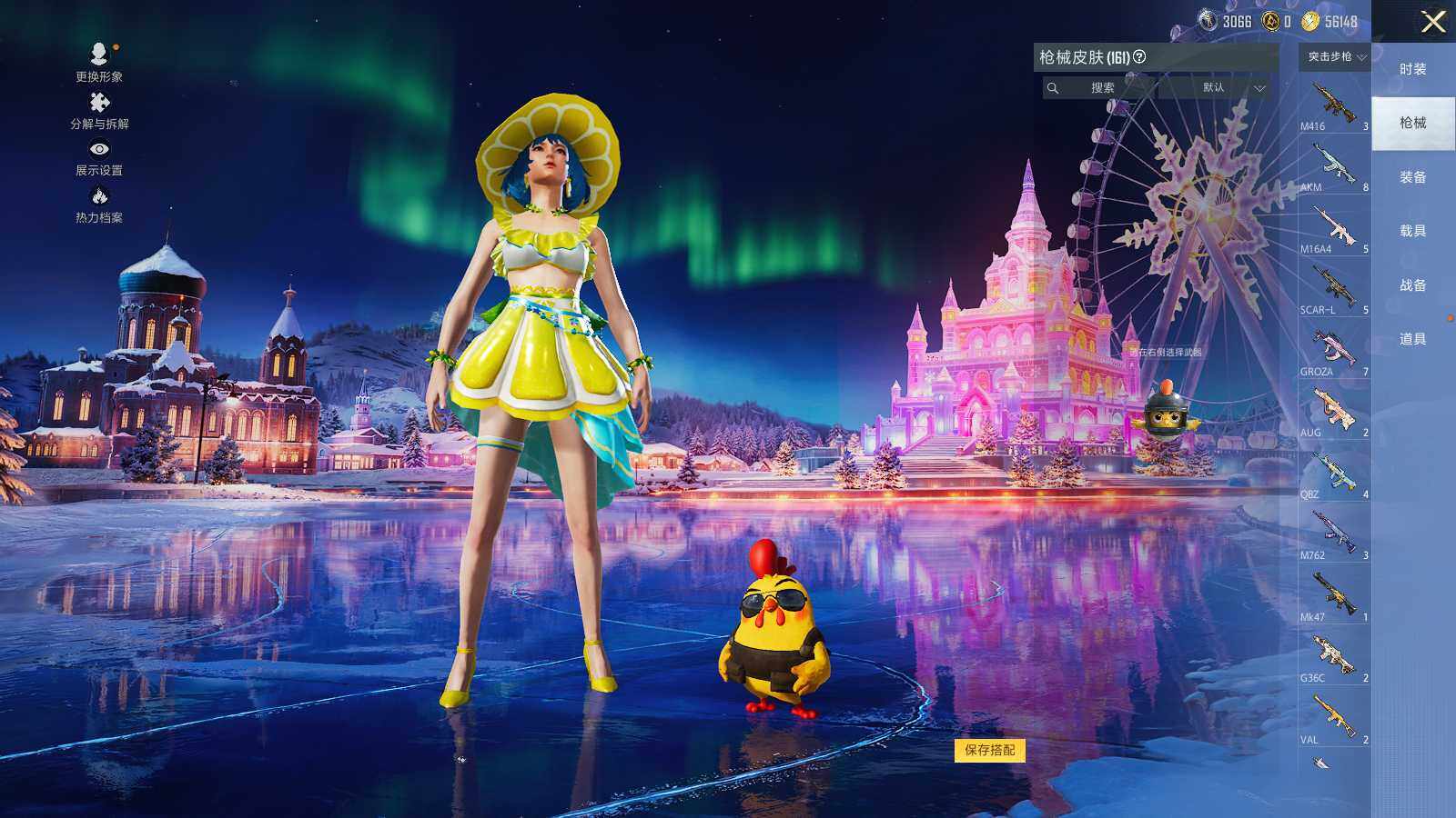 M416-五爪金龙,GROZA-镜光银凌,AUG-暖羊咩咩,UMP45-量子极限,Kar98K-巳巳如意,MG3-梦幻舞会
