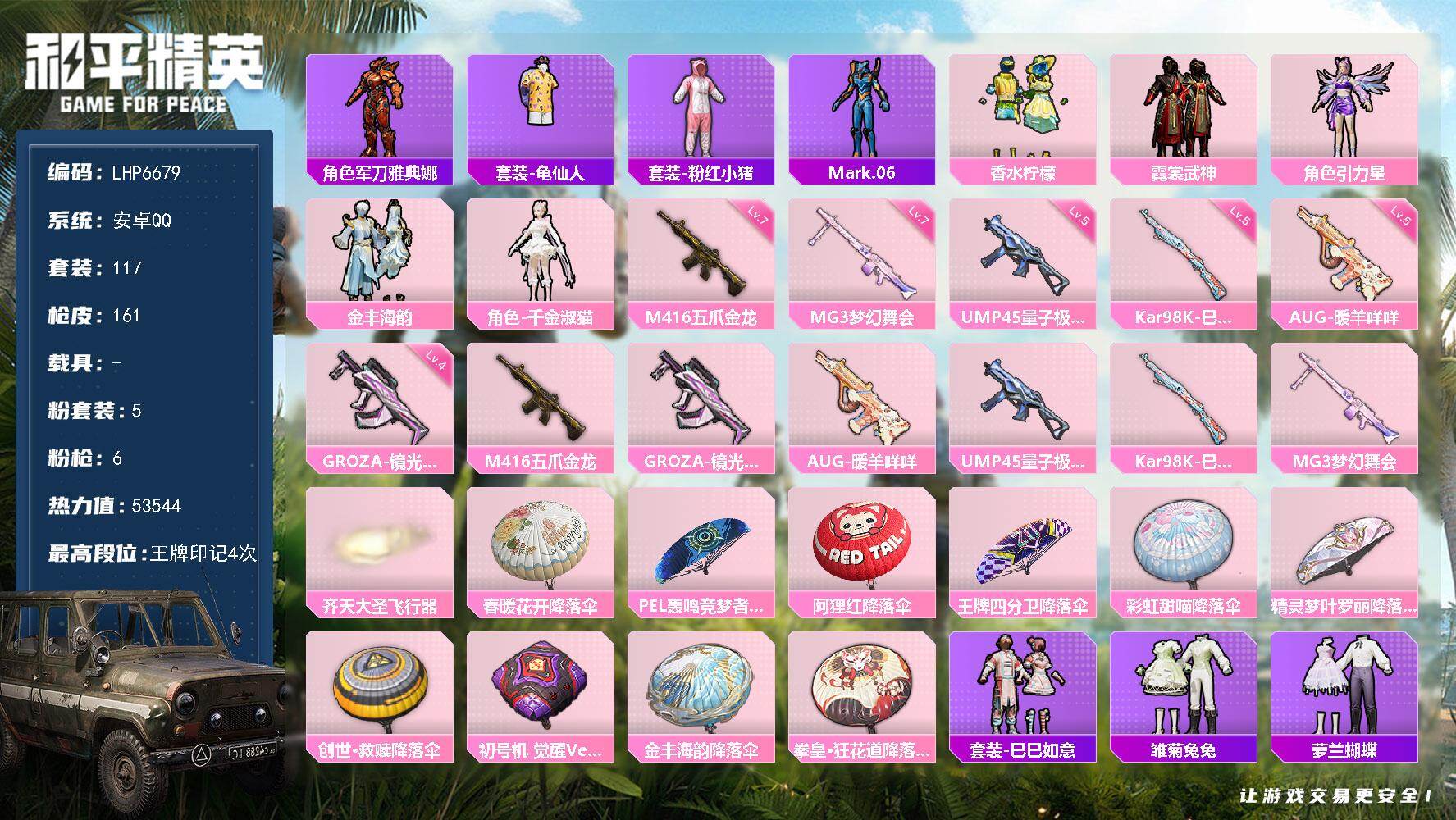 [14389118]可二次【店主推荐捡漏号!可直接换绑】/地铁满天赋 安卓 手Q-5粉装-6特效枪-2粉色飞行器-5.3w热力值-4王牌印记-117套装-161枪皮【热门品类】:角色-军刀雅典娜,套装-龟仙人,套装-粉红小猪,角色-Mark.06【粉色套装】:粉装-香水柠檬,粉装-霓裳武神,角色-引力星,粉装-金丰海韵,角色-千金淑猫【粉色枪皮等级】:M416-五爪金龙(七级),GROZA-镜光银凌(四级),AUG-暖羊咩咩(五级),UMP45-量子极限(五级),Kar98K-巳巳如意(五级),MG3-梦幻舞会(七级)【粉色飞行器】:齐天大圣飞行器