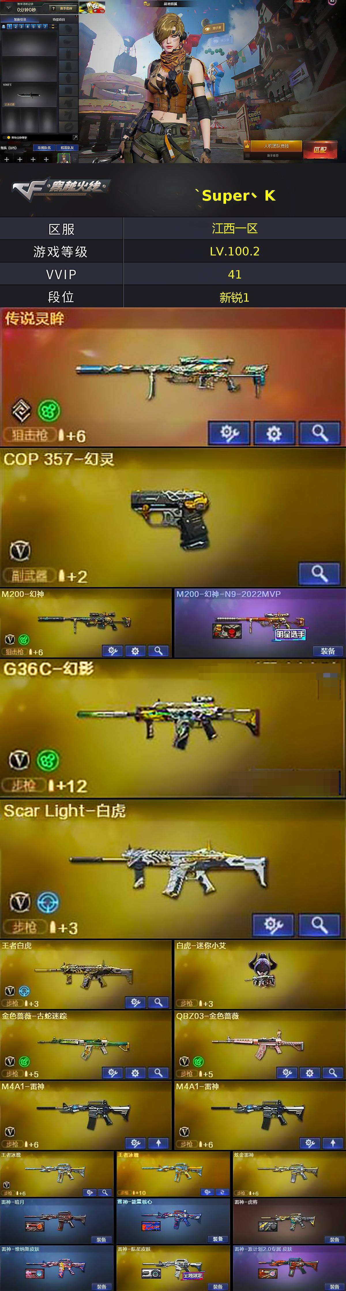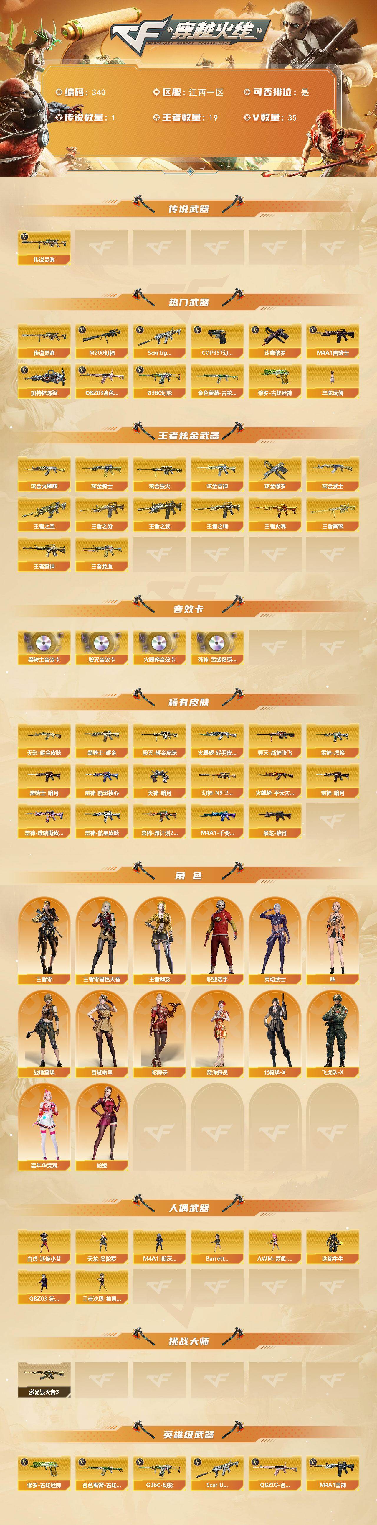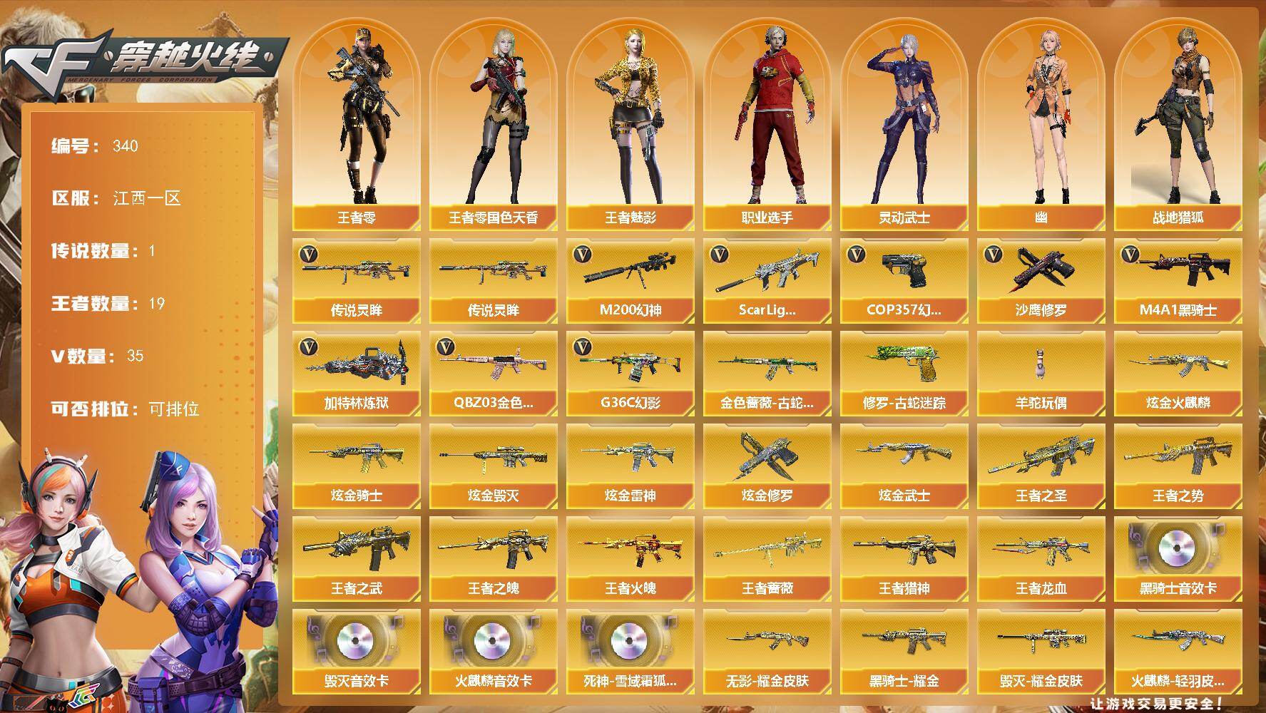 [14390007]江西一区-35V-19王者-6炫金 【传说武器】:传说灵眸 【热门武器】:传说灵眸,G36C-幻影,QBZ03-金色蔷薇,Scar Light-白虎,M200-幻神,金色蔷薇-古蛇迷踪,修罗-古蛇迷踪,M4A1-黑骑士,加特林-炼狱,羊驼玩偶,COP 357-幻灵,沙鹰-修罗*3 【王者炫金武器】:王者之圣,王者之势,王者之武,王者之魄,王者火魄,王者龙血,王者猎神,王者蔷薇,炫金火麒麟,炫金骑士,炫金雷神,炫金武士,炫金毁灭,炫金修罗 【音效卡】:AK47-火麒麟音效卡,M4A1-黑骑士音效卡,Barrett-毁灭音效卡,死神-雪域霜狐-怀旧音效卡 【皮肤】:M200-幻神-N9-2022MVP,雷神-暗月,雷神-能量核心,雷神-虎将,雷神-维纳斯皮肤,雷神-航星皮肤,雷神-源计划2.0专属 皮肤,火麒麟-轻羽皮肤,火麒麟-平天大圣,毁灭耀金皮肤,毁灭-战神张飞,M4A1-千变-孔明皮肤,黑龙-暗月*2,黑骑士-暗月,黑骑士耀金皮肤,无影耀金皮肤,天神-暗月 【角色】:战地猎狐,王者-零-国色天香,王者-零,王者-魅影,雪域霜狐,蛇隐宗,奇洋探员,北极狐-X,飞虎队-X,嘉年华灵狐,灵动武士,蛇姬,幽,职业选手 【人偶武器】:白虎-迷你小艾,天龙-曼陀罗,QBZ03-街机-飒爽刀锋,王者沙鹰-神勇金戈,AWM-灵狐-15周年嘉年华,迷你牛牛,M4A1-斯沃特,Barrett-夜玫瑰 【挑战大师】:激光毁灭者III 【英雄级武器】:AK47-火麒麟,M4A1-黑龙,M4A1-雷神*2,M4A1-黑骑士,AK12-天启,M4A1-武圣,Scar Light-白虎,M4A1-幻灵,无影-神兵利器,G36C-幻影,黑武士-锦绣游龙,金色蔷薇-古蛇迷踪,死神-雪域霜狐,QBZ03-金色蔷薇,王者之心-觉醒版,王者之势-觉醒版,王者冰魄-觉醒版,王者白虎-觉醒版,王者风势-觉醒版,Barrett-毁灭,M200-幻神,Barrett-朱雀,加特林-炼狱,沙鹰-修罗*3,COP 357-幻灵,修罗-古蛇迷踪,屠龙*5,擎天,麒麟刺,幻灵之锋,王者之锋-觉醒版,手雷-热带奇洋,高爆手雷-古蛇迷踪,烟雾弹-古蛇迷踪,M4A1-赤狱骑士 【道具】:CFS限定背包,云山科技背包,亚洲杯纪念炫彩背包,古蛇迷踪炫彩背包,奇洋探员-海龟背包,超级背包,雪域霜狐炫彩背包,女皇终结者-魔龙之吻