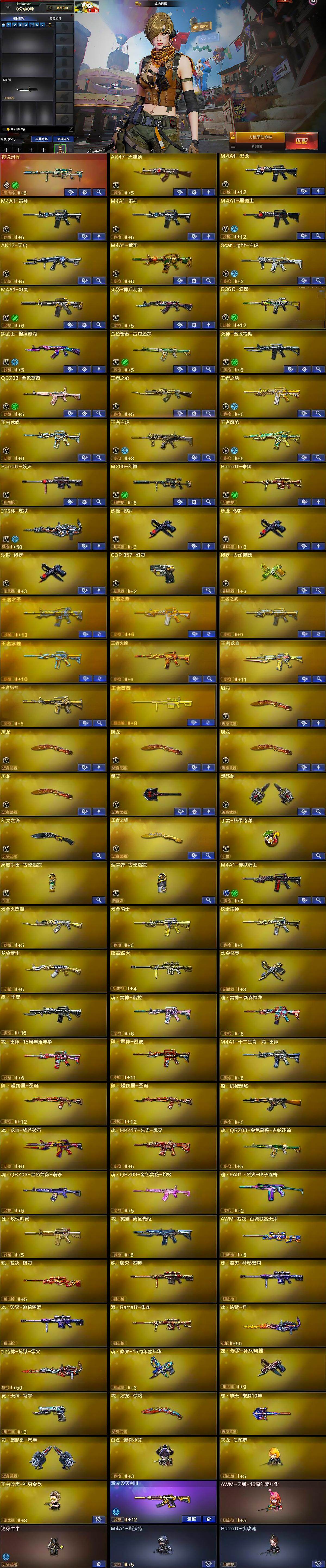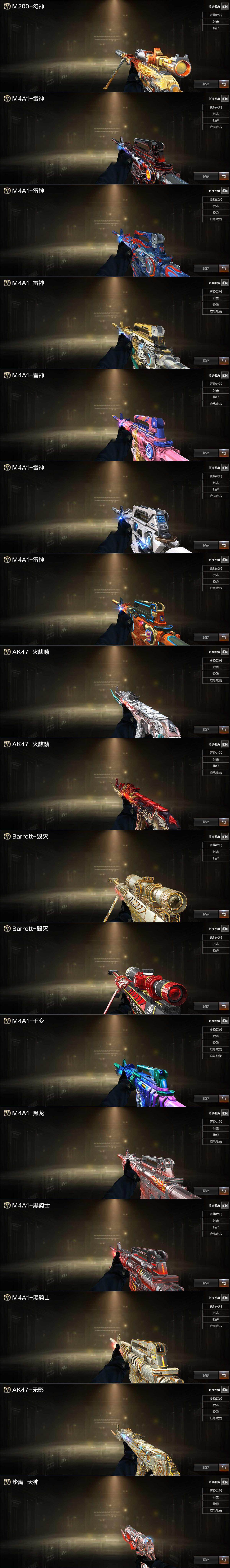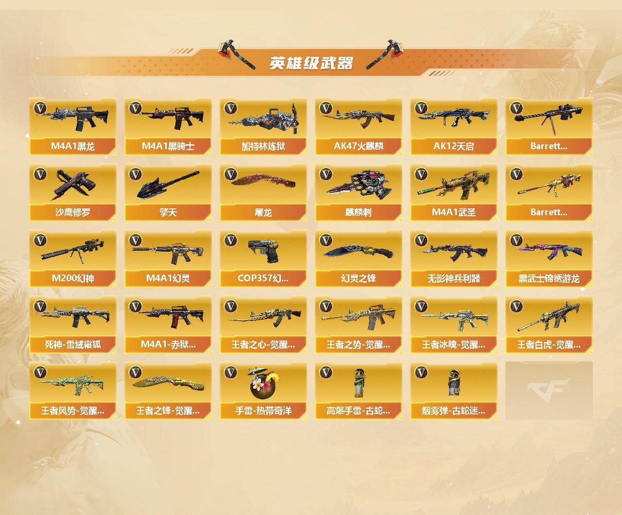 【英雄级武器】:AK47-火麒麟,M4A1-黑龙,M4A1-雷神*2,M4A1-黑骑士,AK12-天启,M4A1-武圣,Scar Light-白虎,M4A1-幻灵,无影-神兵利器,G36C-幻影,黑武士-锦绣游龙,金色蔷薇-古蛇迷踪,死神-雪域霜狐,QBZ03-金色蔷薇,王者之心-觉醒版,王者之势-觉醒版,王者冰魄-觉醒版,王者白虎-觉醒版,王者风势-觉醒版,Barrett-毁灭,M200-幻神,Barrett-朱雀,加特林-炼狱,沙鹰-修罗*3,COP 357-幻灵,修罗-古蛇迷踪,屠龙*5,擎天,麒麟刺,幻灵之锋,王者之锋-觉醒版,手雷-热带奇洋,高爆手雷-古蛇迷踪,烟雾弹-古蛇迷踪,M4A1-赤狱骑士