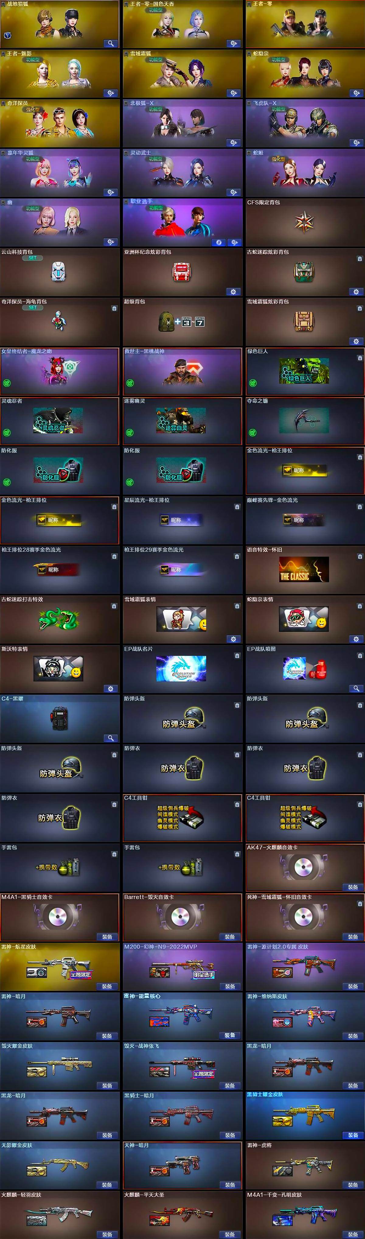 - [15376771]陕西一区-30V-2王者-0炫金 【热门武器】:QBZ03-金色蔷薇,M200-幻神,白虎-电玩蓝兔,加特林-炼狱 【音效卡】:M200-幻神音效卡,M4A1-黑骑士音效卡,M4A1-赤狱骑士-怀旧音效卡,Barrett-碧霄极光音效卡,白虎-盛典舞曲音效卡,炼狱-百战金芒-庆典舞曲音效卡 【皮肤】:M200-幻神-黄忠皮肤,雷神-暗月,雷神-星空,M4A1-再燃火线,雷神-神秘按键 皮肤,火麒麟-战神关羽,毁灭-暗月,毁灭-荣耀之怒,毁灭-英雄计划 皮肤,战神-粉色甜心皮肤,战神-紫绶金章皮肤,战神-流金岁月皮肤,AK47-B-常胜将军-刘备,AK47-B-常胜将军-孙权,轻型军用手斧-再燃火线 【角色】:乔伊教练,修道士,嘉年华灵狐,娟娟,灵狐者-黄金海岸,曼陀罗-X,潘多拉-甜心教官,蜀雪,雪莉杨-摸金校尉 【人偶武器】:M4A1-雷神-精英刀锋,AWM-灵狐-15周年嘉年华,COP-旗袍,闪光弹-貂蝉,高爆手雷-大乔 【暴走生化】:超级对讲机 【英雄级武器】:AK47-火麒麟,M4A1-雷神*2,QBZ03-独角-III,QBZ03-金色蔷薇,AK47-B-战神,黑骑士-海王,AK47-B-常胜将军,白虎-电玩蓝兔,Barrett-毁灭,M200-幻神,加特林-炼狱,炼狱-百战金芒,屠龙,斩神刀-雷暴,麒麟刺-百战金芒,王者之锋-觉醒版,丛林匕首-玄豹,高爆手雷-雷暴,闪光弹-雷暴,闪光弹-玄豹*2,烟雾弹-雷暴,M4A1-赤狱骑士 【道具】:BS战队炫彩背包,CFS限定背包,云山科技背包,百战金芒炫彩背包,背包-葫芦兄弟,超级背包,女皇终结者-魔龙之吻,救世主-黑桃战神,绿色巨人,灵魂忍者,妖姬,迷雾幽灵,夺命之镰,防化服*3,流光-鎏金之域,语音特效-盛典烟火,萌萌小葵表情,防弹头盔*3,防弹衣*3,C4工具钳*3,手雷包*3 【特殊枪械】:1炼狱