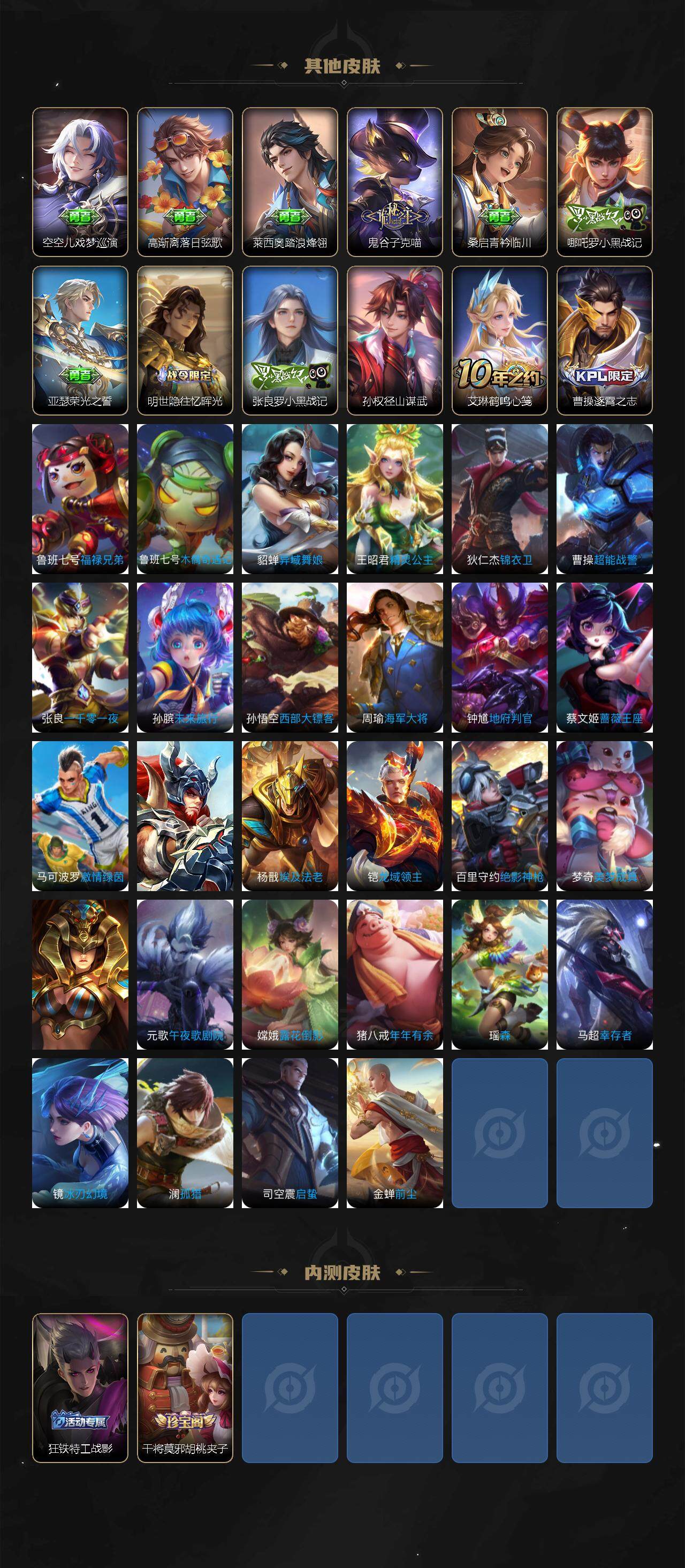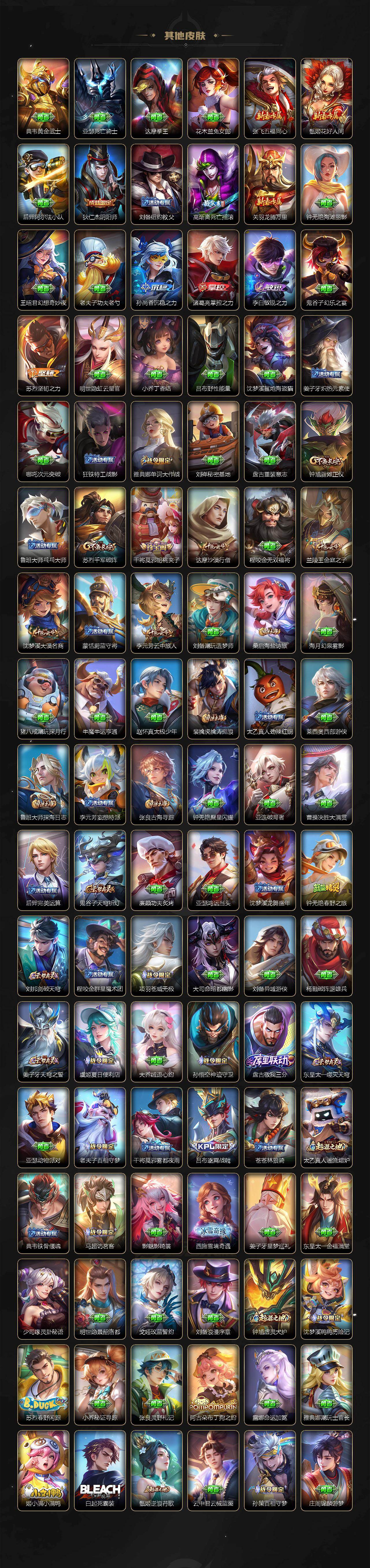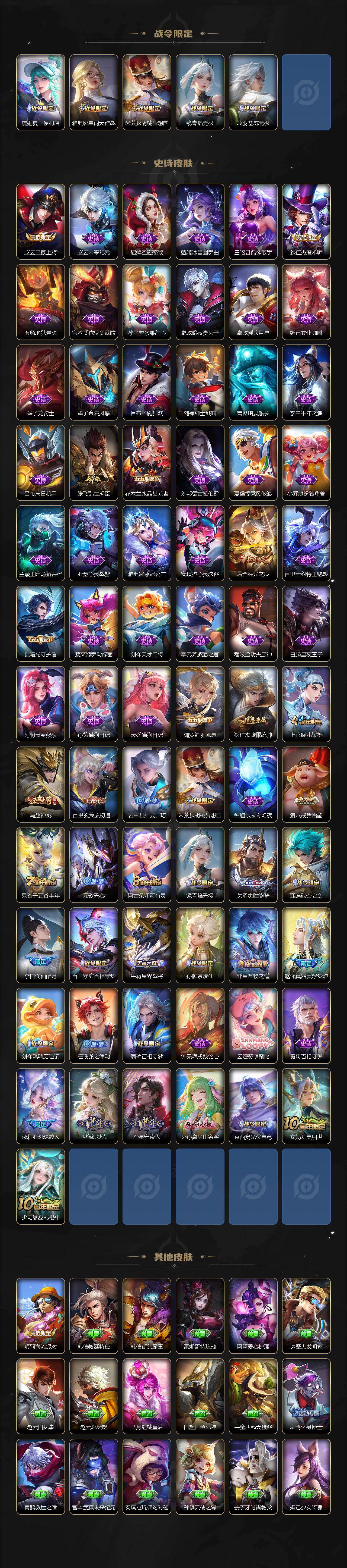 【限定皮肤】:大乔绒语心约,虞姬夏日便利店,姜子牙天穹之誓,杨戬破阵退雄兵,李白谪仙醉月,狄仁杰阴阳师,赵云皇家上将,高渐离死亡摇滚,元歌无心,狄仁杰魔术师,达摩沙漠行僧,项羽海滩派对,兰陵王金庭之子,孙悟空齐天大圣,后羿辉光之辰,李元芳云中旅人,钟馗驱傩正仪,干将莫邪胡桃夹子,雅典娜单词大作战,鬼谷子五谷丰年,苏烈千军破阵,百里玄策原初追逐者,沈梦溪大漠名商,裴擒虎擒涛扼浪,米莱狄胡桃异想国,云中君纤云弄巧,猪八戒猪悟能,上官婉儿梁祝,鲁班大师探海日志,桑启海盐诗旅,阿古朵江河有灵,张良古海寻踪,鬼谷子天穹祈灯,沈梦溪龙舞盛年,刘邦剑破天穹,程咬金群星魔术团,关羽决胜骁骑,镜青焰无极,项羽苍威无极,刘备异域游侠