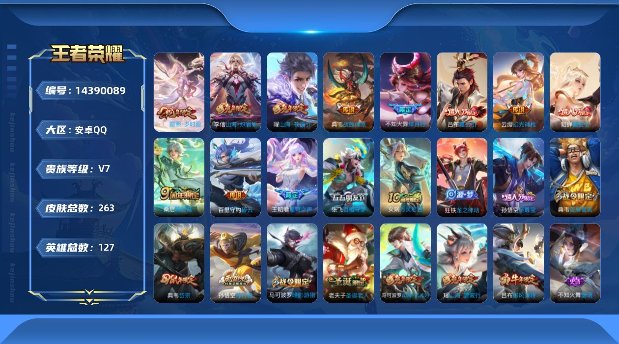[14390089]可二次【店主推荐捡漏号!可直接换绑/3306星币可兑换星元皮肤】:安卓Q-V7-最强王者段位-127英雄-263皮肤-14传说-70史诗