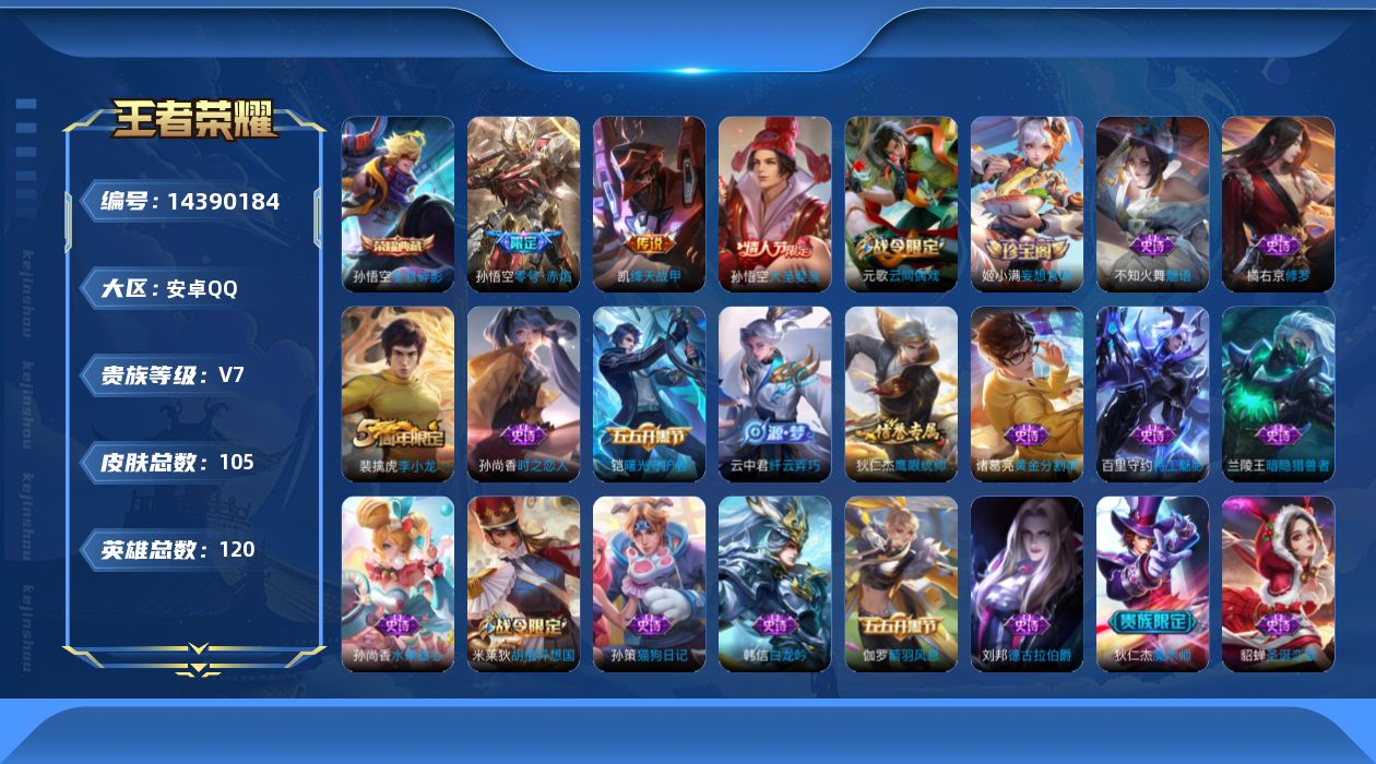 [14390184]安卓Q-V7-105皮肤-1典藏皮肤-2传说-28史诗 【荣耀典藏】:孙悟空全息碎影 【传说皮肤】:铠绛天战甲,孙悟空零号赤焰 【限定皮肤】:狄仁杰阴阳师,赵云皇家上将,元歌云间偶戏,狄仁杰魔术师,狄仁杰万华元夜,达摩星际陆战队,达摩沙漠行僧,项羽海滩派对,程咬金演武夺筹,兰陵王金庭之子,亚瑟潮玩骑士王,孙悟空大圣娶亲,孙悟空零号赤焰,钟馗驱傩正仪,雅典娜单词大作战,鬼谷子原初探秘者,苏烈千军破阵,裴擒虎李小龙,裴擒虎擒涛扼浪,米莱狄胡桃异想国,云中君纤云弄巧,蒙犽狂想玩偶喵,鲁班大师探海日志,桑启海盐诗旅,张良古海寻踪,鬼谷子天穹祈灯,姬小满妄想食味 【赛季限定】:狄仁杰万华元夜,达摩沙漠行僧,程咬金演武夺筹,兰陵王金庭之子,张良古海寻踪,钟馗驱傩正仪,鬼谷子原初探秘者,苏烈千军破阵,裴擒虎擒涛扼浪,鲁班大师探海日志,桑启海盐诗旅,鬼谷子天穹祈灯 【战令限定】:元歌云间偶戏,达摩星际陆战队,亚瑟潮玩骑士王,雅典娜单词大作战,米莱狄胡桃异想国,蒙犽狂想玩偶喵 【史诗皮肤】:赵云皇家上将,貂蝉圣诞恋歌,王昭君偶像歌手,狄仁杰魔术师,孙尚香水果甜心,嬴政摇滚巨星,妲己魅力维加斯,韩信白龙吟,刘邦德古拉伯爵,兰陵王暗隐猎兽者,诸葛亮黄金分割率,雅典娜冰冠公主,百里守约特工魅影,铠曙光守护者,刘禅天才门将,孙策猫狗日记,孙悟空大圣娶亲,伽罗箭羽风息,狄仁杰鹰眼统帅,不知火舞魅语,橘右京修罗,孙尚香时之恋人,蒙犽狂想玩偶喵,裴擒虎李小龙,云中君纤云弄巧,元歌云间偶戏,米莱狄胡桃异想国,姬小满妄想食味 【其他皮肤】:项羽海滩派对,韩信街头霸王,达摩大发明家,赵云忍炎影,芈月红桃皇后,程咬金爱与正义,宫本武藏未来纪元,安琪拉玩偶对对碰,孙膑天使之翼,妲己少女阿狸,亚瑟死亡骑士,花木兰兔女郎,宫本武藏万象初新,后羿阿尔法小队,狄仁杰阴阳师,刘备汉昭烈帝,狂铁命运角斗场,项羽科学大爆炸,吕布野性能量,哪吒次元突破,鬼谷子原初探秘者,雅典娜单词大作战,狄仁杰万华元夜,亚瑟潮玩骑士王,刘禅秘密基地,达摩星际陆战队,程咬金演武夺筹,张良缤纷绘卷,钟馗驱傩正仪,鲁班大师乓乓大师,苏烈千军破阵,达摩沙漠行僧,兰陵王金庭之子,桑启海盐诗旅,猪八戒潮玩探月行,裴擒虎擒涛扼浪,鲁班大师探海日志,张良古海寻踪,鬼谷子天穹祈灯,东皇太一噬灭天穹,亚瑟荣光之誓,艾琳鹤鸣心笺,鲁班七号福禄兄弟,鲁班七号木