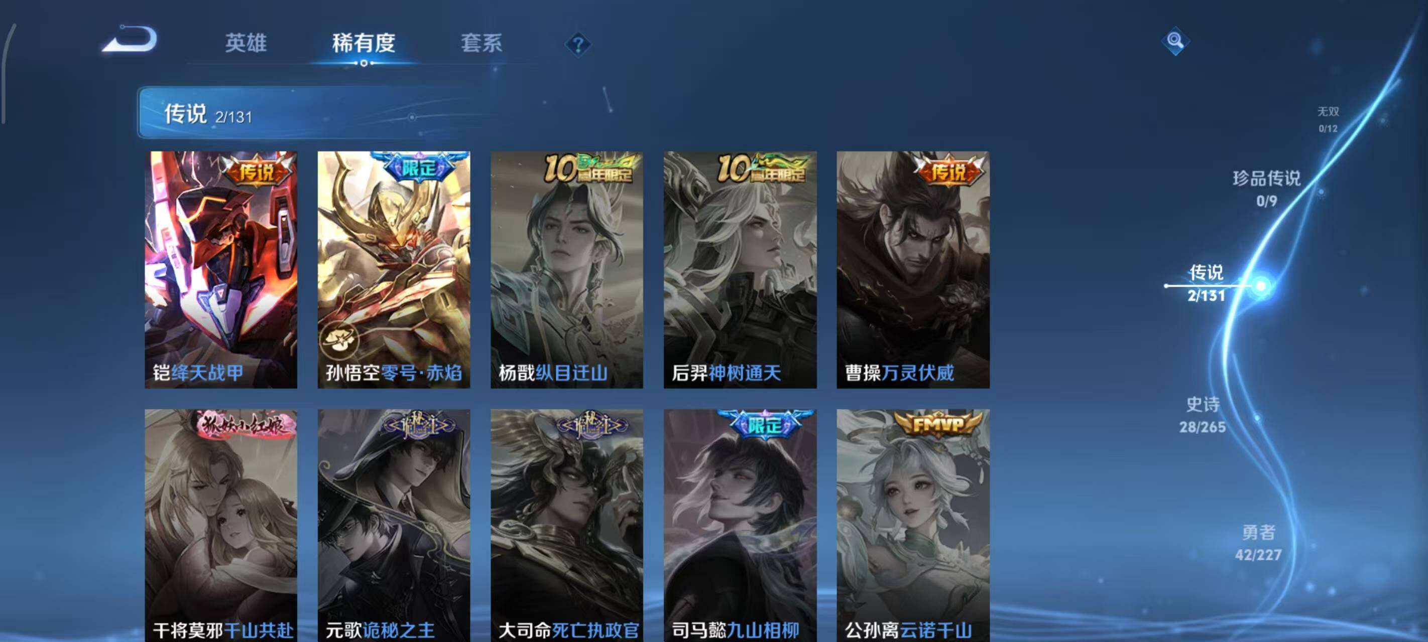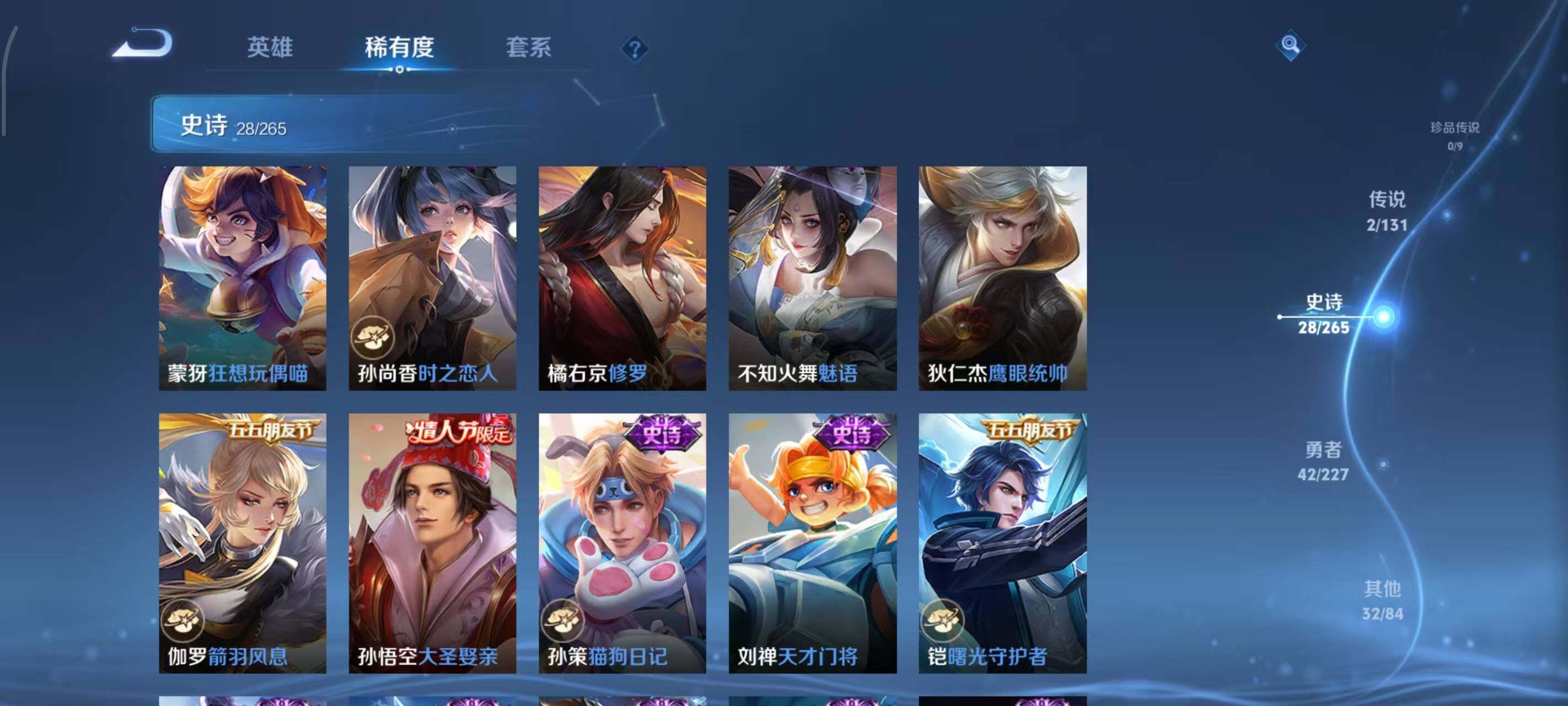 【史诗皮肤】:赵云皇家上将,貂蝉圣诞恋歌,王昭君偶像歌手,狄仁杰魔术师,孙尚香水果甜心,嬴政摇滚巨星,妲己魅力维加斯,韩信白龙吟,刘邦德古拉伯爵,兰陵王暗隐猎兽者,诸葛亮黄金分割率,雅典娜冰冠公主,百里守约特工魅影,铠曙光守护者,刘禅天才门将,孙策猫狗日记,孙悟空大圣娶亲,伽罗箭羽风息,狄仁杰鹰眼统帅,不知火舞魅语,橘右京修罗,孙尚香时之恋人,蒙犽狂想玩偶喵,裴擒虎李小龙,云中君纤云弄巧,元歌云间偶戏,米莱狄胡桃异想国,姬小满妄想食味
