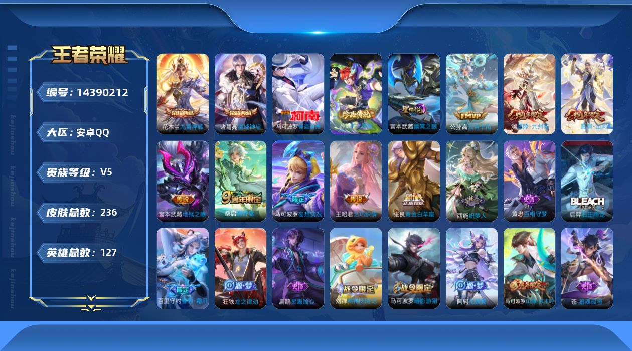 [14390212]【店主推荐捡漏号!可直接换绑】安卓Q-V5-最强王者段位-127英雄-236皮肤-2典藏皮肤-2珍品传说-8传说-65史诗