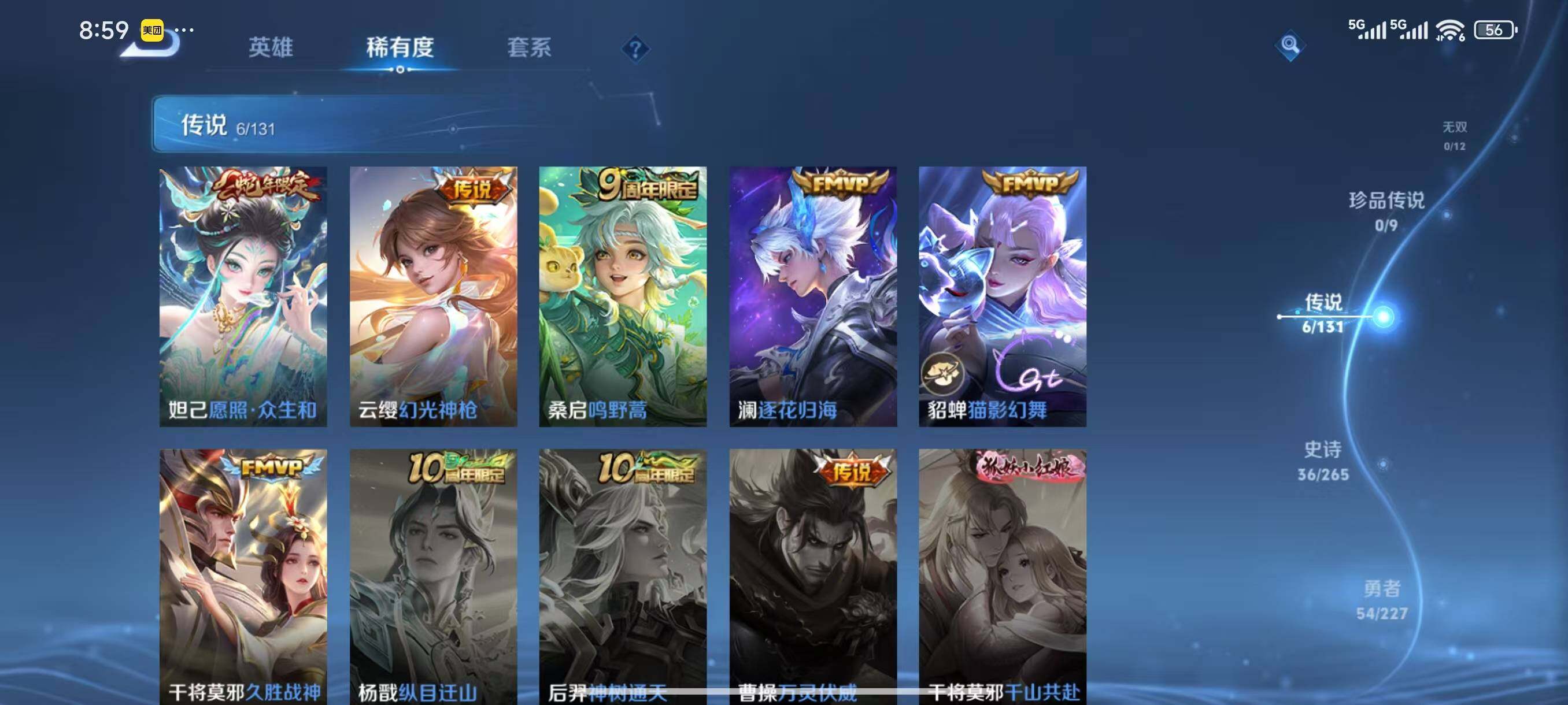 【传说皮肤】:妲己愿照众生和,云缨幻光神枪,桑启鸣野蒿,澜逐花归海,貂蝉猫影幻舞,干将莫邪久胜战神