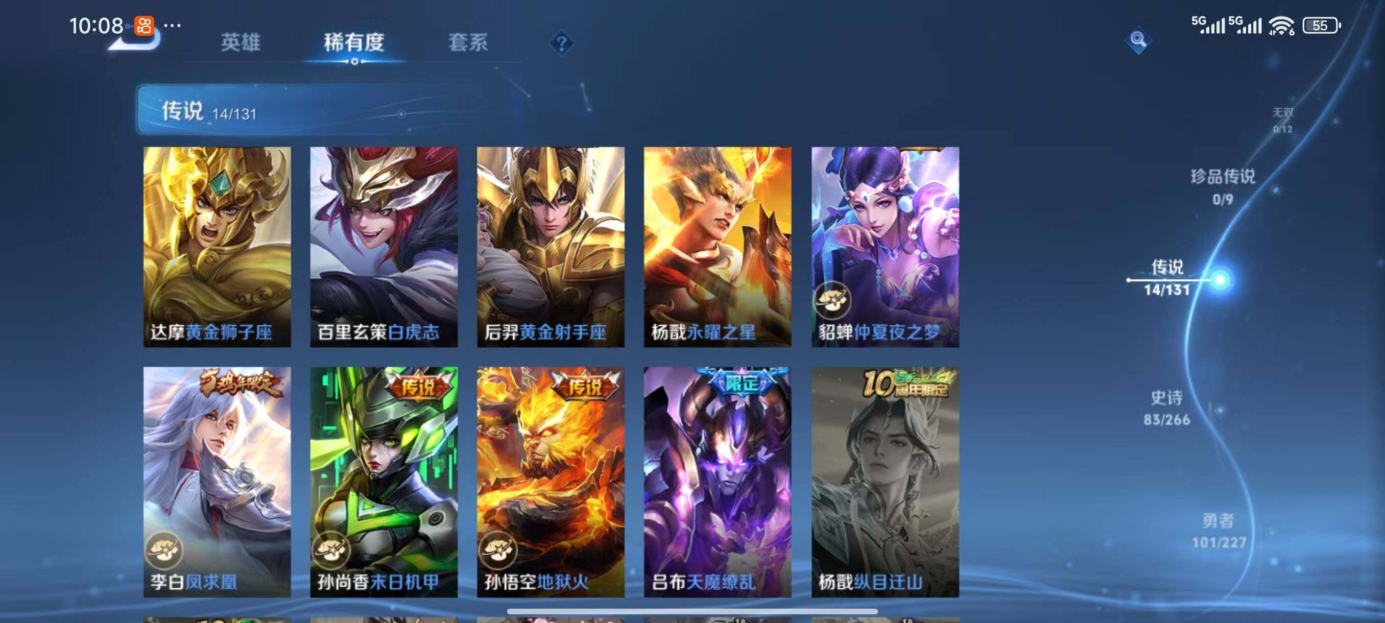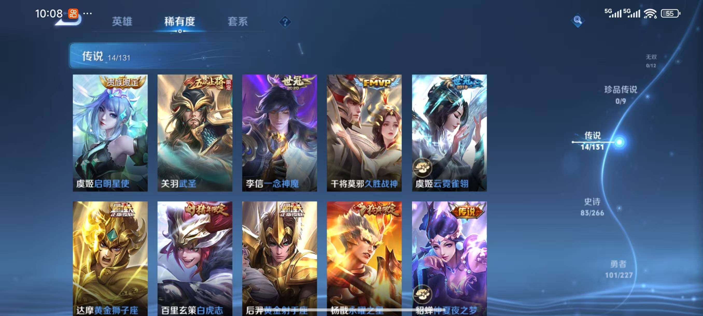 【传说皮肤】:虞姬启明星使,关羽武圣,李信一念神魔,干将莫邪久胜战神,虞姬云霓雀翎,达摩黄金狮子座,百里玄策白虎志,后羿黄金射手座,杨戬永曜之星,貂蝉仲夏夜之梦,李白凤求凰,孙尚香末日机甲,孙悟空地狱火,吕布天魔缭乱