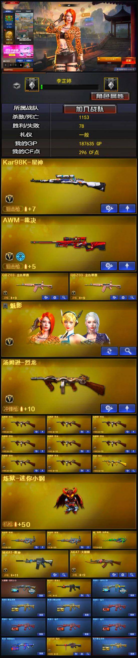 【热门武器】:QBZ03-金色蔷薇*2,Kar98K-星神,炼狱-迷你小钢,M4A1-黑骑士,汤姆逊-烈龙*9,加特林-炼狱*2,沙鹰-修罗*6