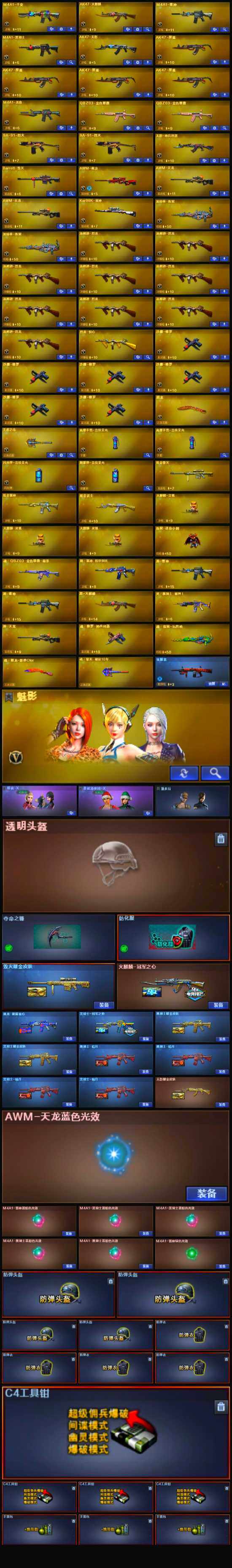 【英雄级武器】:高爆手雷-竞技荣光*2,烟雾弹-竞技荣光,闪光弹-竞技荣光,QBZ03-金色蔷薇*2,无影-神兵利器,M4A1-雷神,M4A1-黑骑士,加特林-炼狱*2,汤姆逊-烈龙*9,AK47-无影,AK47-火麒麟,AWM-天龙*2,Barrett-毁灭,AWM-裁决,M4A1-龙血,Kar98K-星神,AK47-黑鲨*4,M4A1-千变,沙鹰-修罗*6,屠龙