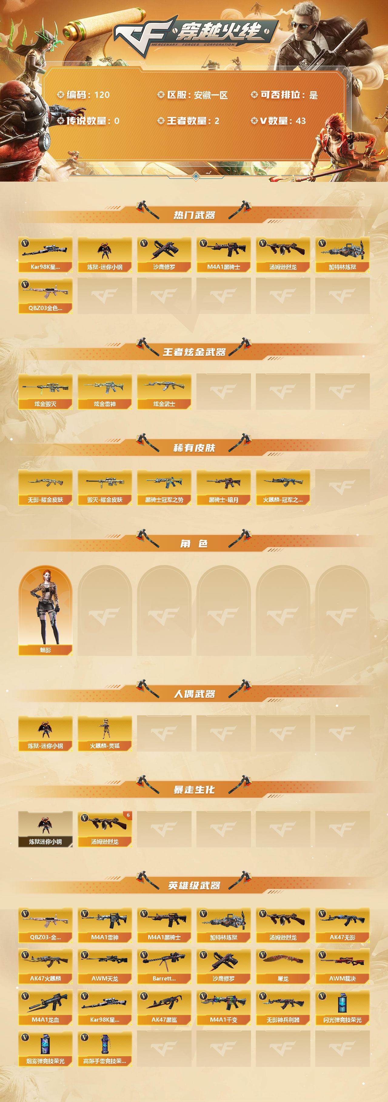 - [15605410]安徽一区-18V-1王者-0炫金 【热门武器】:汤姆逊-烈龙,沙鹰-修罗*4 【音效卡】:Barrett-毁灭音效卡 【皮肤】:M4A1-雷神-新春神龙皮肤,火麒麟-轻羽皮肤,火麒麟-平天大圣,毁灭耀金皮肤,黑骑士-破浪10年皮肤,轻型军用手斧-再燃火线 【角色】:机械姬,初恋灵狐,电竞少女,风暴女,嘉年华灵狐,猎狐者-追月,灵狐者-黄金海岸,麻雀,曼陀罗-X,潘多拉-X,潜龙队-X,邱刚敖,斯沃特-X,新灵狐者,雪莉杨 【人偶武器】:天龙-曼陀罗,AWM-灵狐-15周年嘉年华,迷你牛魔王,灵狐娃娃手雷 【暴走生化】:超级对讲机 【英雄级武器】:AK47-火麒麟,M4A1-雷神,无影-神兵利器,王者之魄-觉醒版,AK-47-猩红传说,加利尔ACE-天袭,Barrett-毁灭,汤姆逊-烈龙,沙鹰-修罗*4,麒麟刺 【道具】:XROCK炫彩背包,炫彩背包,超级背包,生化弹匣,夺命之镰,防化服,金色流光-枪王排位*2,星辰流光-枪王排位,防弹头盔*2,防弹衣*2,C4工具钳*2,手雷包*2 【特殊枪械】:1烈龙