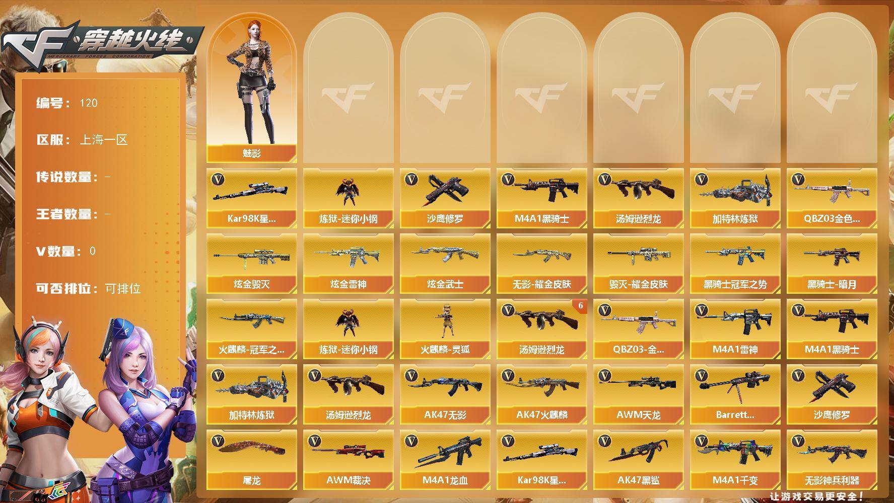 [14391317]上海一区-43V-2王者-3炫金 【热门武器】:QBZ03-金色蔷薇*2,Kar98K-星神,炼狱-迷你小钢,M4A1-黑骑士,汤姆逊-烈龙*9,加特林-炼狱*2,沙鹰-修罗*6 【王者炫金武器】:炫金毁灭,炫金雷神,炫金武士 【稀有皮肤】:火麒麟-冠军之心,黑骑士-暗月*4,黑骑士-冠军之势,毁灭耀金皮肤,无影耀金皮肤 【角色】:魅影 【人偶武器】:火麒麟-灵狐*3,炼狱-迷你小钢 【暴走生化】:炼狱-迷你小钢 【英雄级武器】:高爆手雷-竞技荣光*2,烟雾弹-竞技荣光,闪光弹-竞技荣光,QBZ03-金色蔷薇*2,无影-神兵利器,M4A1-雷神,M4A1-黑骑士,加特林-炼狱*2,汤姆逊-烈龙*9,AK47-无影,AK47-火麒麟,AWM-天龙*2,Barrett-毁灭,AWM-裁决,M4A1-龙血,Kar98K-星神,AK47-黑鲨*4,M4A1-千变,沙鹰-修罗*6,屠龙 【特殊枪械】:1黑骑士,6烈龙,2炼狱