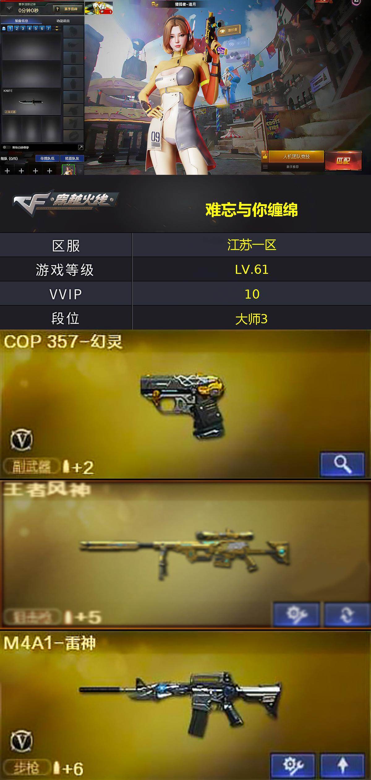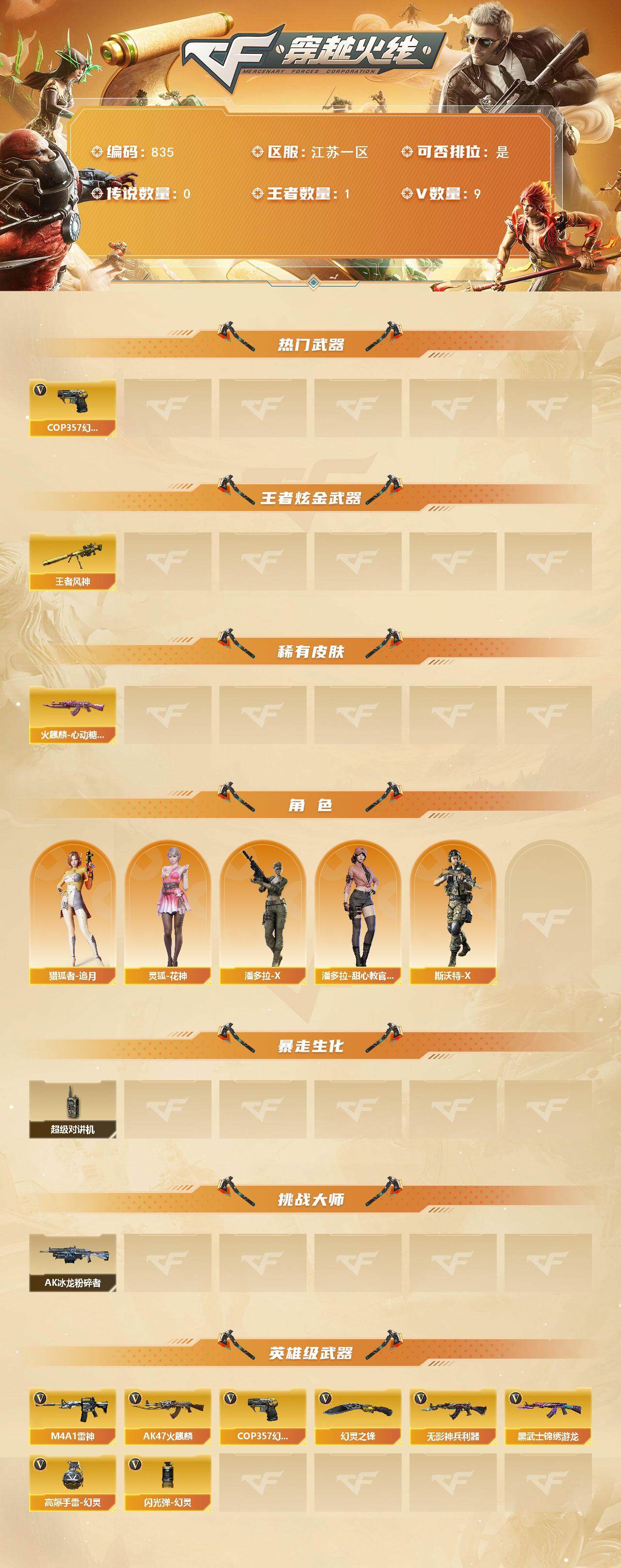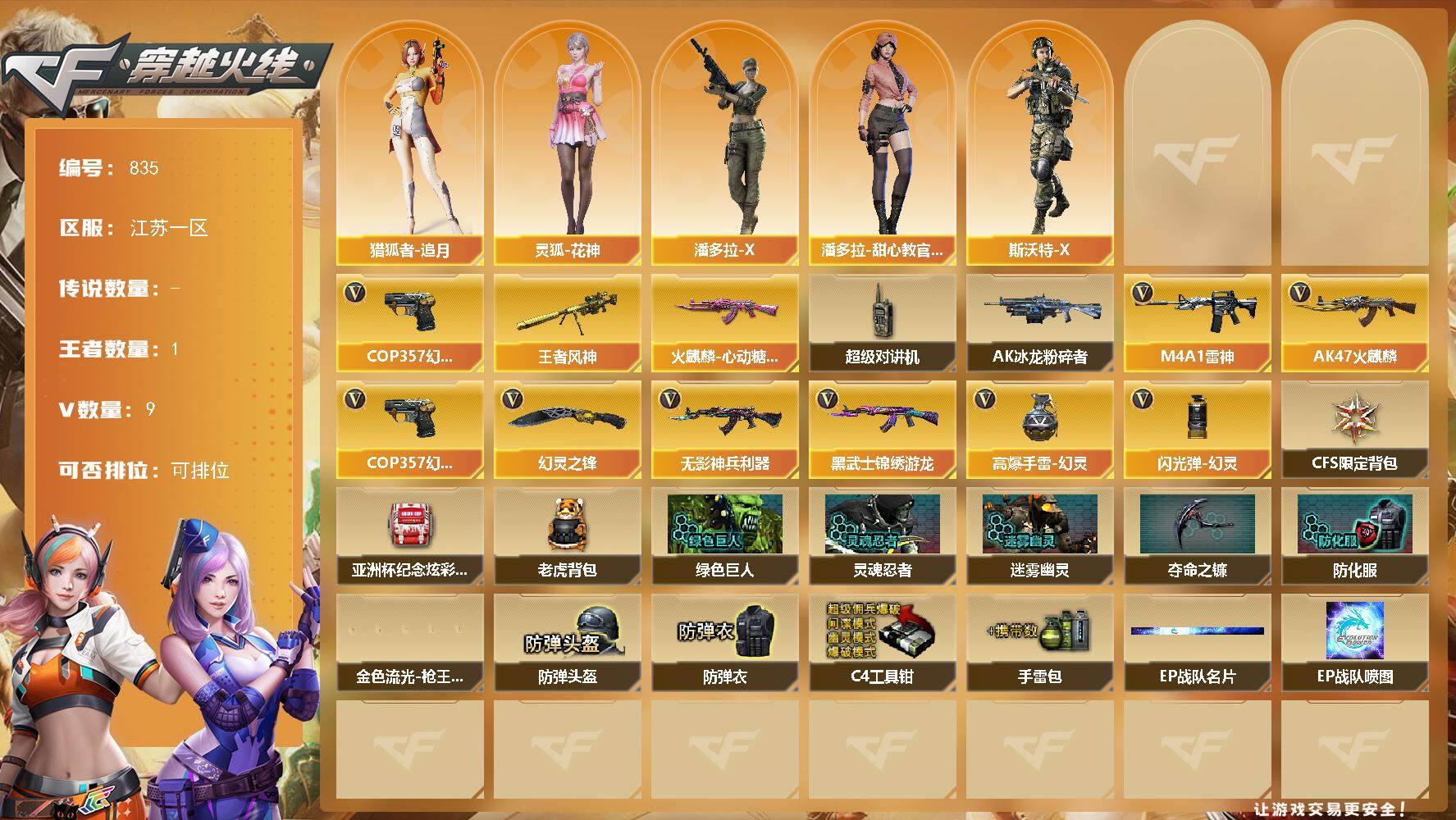 [14392609]江苏一区-9V-1王者-0炫金 【热门武器】:COP 357-幻灵 【王者炫金武器】:王者风神 【皮肤】:火麒麟-心动糖果 【角色】:猎狐者-追月,灵狐-花神,潘多拉-X,潘多拉-甜心教官,斯沃特-X 【暴走生化】:超级对讲机 【挑战大师】:AK47-冰龙粉碎者 【英雄级武器】:AK47-火麒麟,M4A1-雷神,无影-神兵利器,黑武士-锦绣游龙,COP 357-幻灵,幻灵之锋,高爆手雷-幻灵*2,闪光弹-幻灵 【道具】:CFS限定背包,亚洲杯纪念炫彩背包,老虎背包,绿色巨人,灵魂忍者,迷雾幽灵,夺命之镰,防化服*2,金色流光-枪王排位*2,枪王排位28赛季金色流光,EP战队名片,EP战队喷图,防弹头盔*3,防弹衣*3,C4工具钳*3,手雷包*3 【特殊枪械】: