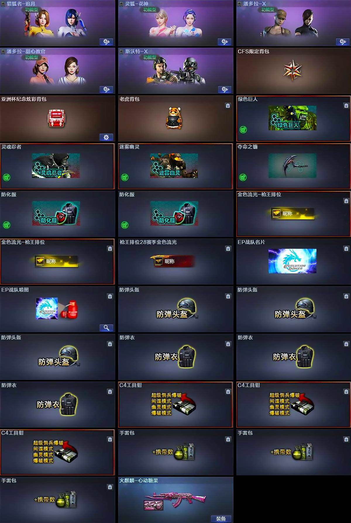 【道具】:CFS限定背包,亚洲杯纪念炫彩背包,老虎背包,绿色巨人,灵魂忍者,迷雾幽灵,夺命之镰,防化服*2,金色流光-枪王排位*2,枪王排位28赛季金色流光,EP战队名片,EP战队喷图,防弹头盔*3,防弹衣*3,C4工具钳*3,手雷包*3