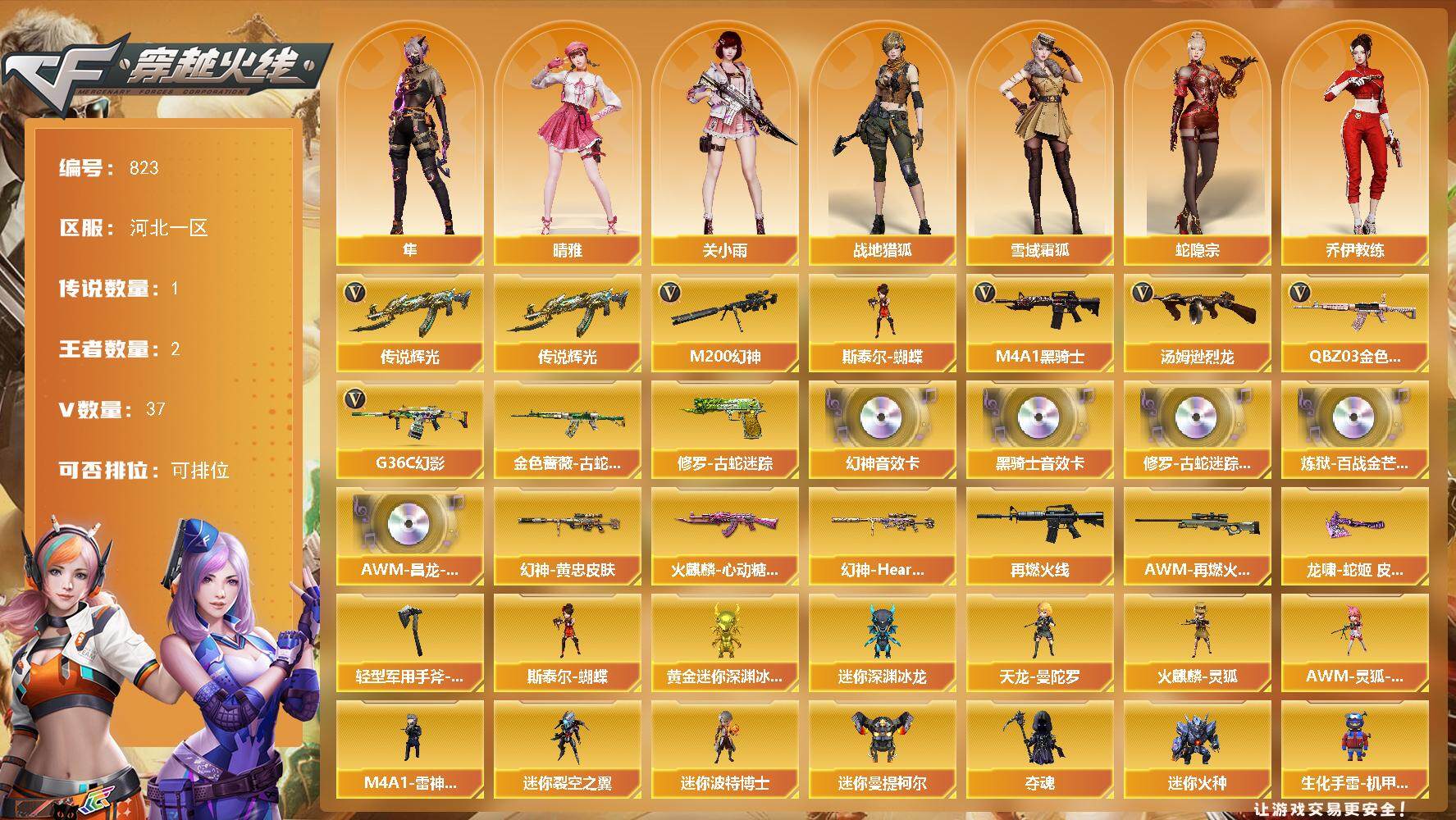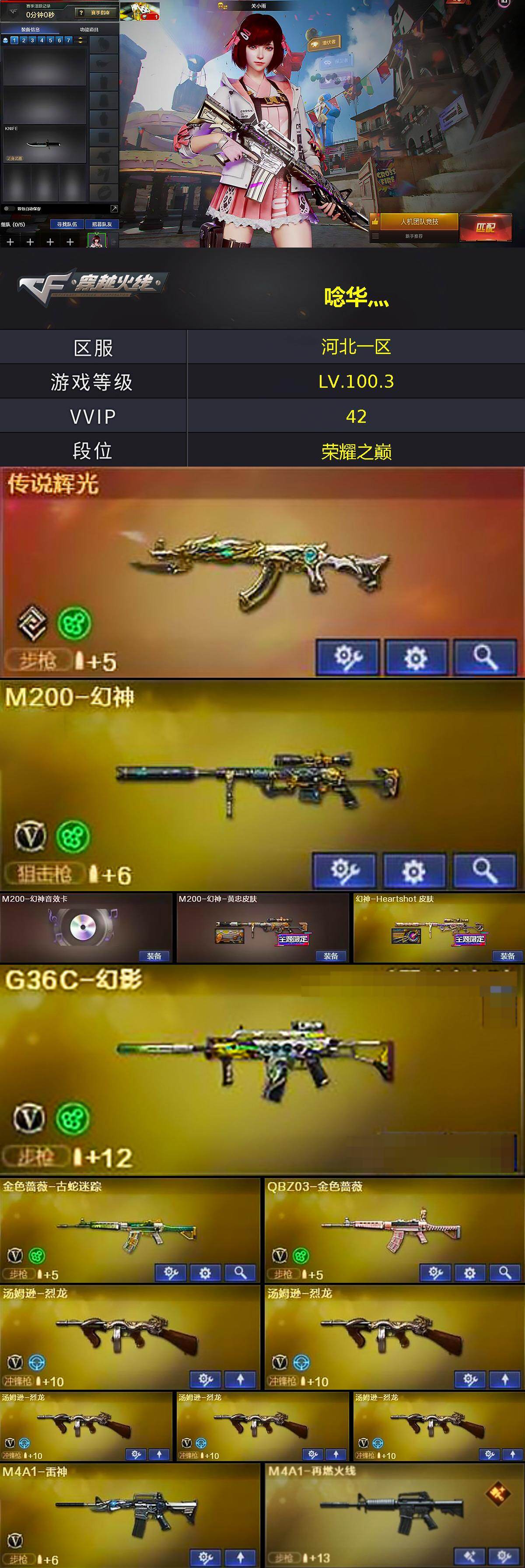 [14392477]河北一区-37V-2王者-0炫金 【传说武器】:传说辉光 【热门武器】:传说辉光,G36C-幻影,QBZ03-金色蔷薇,M200-幻神,金色蔷薇-古蛇迷踪,修罗-古蛇迷踪,M4A1-黑骑士,汤姆逊-烈龙*5,斯泰尔-蝴蝶 【音效卡】:修罗-古蛇迷踪音效卡,M200-幻神音效卡,M4A1-黑骑士音效卡,炼狱-百战金芒-庆典舞曲音效卡,AWM-昌龙-怀旧音效卡 【皮肤】:M200-幻神-黄忠皮肤,幻神-Heartshot 皮肤,M4A1-再燃火线,火麒麟-心动糖果,AWM-再燃火线,龙啸-蛇姬 皮肤,轻型军用手斧-再燃火线 【角色】:关小雨,晴雅,隼,战地猎狐,雪域霜狐,蛇隐宗,奇洋探员,乔伊教练,云海玲珑,芳心审判者,风暴女,嘉年华灵狐,兰妹妹,龙儿,蛇姬,斯沃特-X,兔囡囡 【人偶武器】:天龙-曼陀罗,火麒麟-灵狐,M4A1-雷神-精英刀锋,迷你救赎猎手,斯泰尔-蝴蝶,迷你地狱终结者,AWM-灵狐-15周年嘉年华,黄金迷你深渊冰龙,迷你深渊冰龙*3,迷你裂空之翼*6,迷你波特博士*6,迷你曼提柯尔,夺魂*3,迷你火种*5,生化手雷-机甲核心*2 【挑战大师】:神圣爆裂者III,冰龙粉碎者-白马银枪,激光毁灭者III,机甲撕裂者III,试炼破坏者III*2,阐释者III 【英雄级武器】:AK47-火麒麟*2,M4A1-雷神,M4A1-黑骑士,无影-神兵利器,G36C-幻影,金色蔷薇-古蛇迷踪,QBZ03-金色蔷薇,AK-47-猩红传说,M200-幻神,王者之怒-觉醒版,炼狱-百战金芒,汤姆逊-烈龙*5,修罗-古蛇迷踪,屠龙,擎天-竞技荣光,麒麟刺-百战金芒,高爆手雷-竞技荣光*3,高爆手雷-古蛇迷踪,闪光弹-雷霆,闪光弹-雷暴*2,闪光弹-竞技荣光*2,烟雾弹-雷霆,烟雾弹-雷暴,烟雾弹-竞技荣光,烟雾弹-古蛇迷踪,M4A1-赤狱骑士,AWM-昌龙 【道具】:BS战队炫彩背包,亚洲杯纪念炫彩背包,古蛇迷踪炫彩背包,女皇终结者-背包,次元之矛-背包,炫彩背包-诺拉,白狐背包*2,百战金芒炫彩背包,背包-洛丽塔,超级背包,金狐背包*5,雪域霜狐炫彩背包,黄金巨石泰坦-魔花研究所背包,圣拳猎手-炽雪,女皇终结者-魔龙之吻,救世主-黑桃战神,黄金生化钩,绿色巨人,灵魂忍者,变异宝贝,迷雾幽灵,夺命之镰,防化服*4,金色流光-枪王排位*2,流光-鎏金之域,流光-再燃火线,枪王