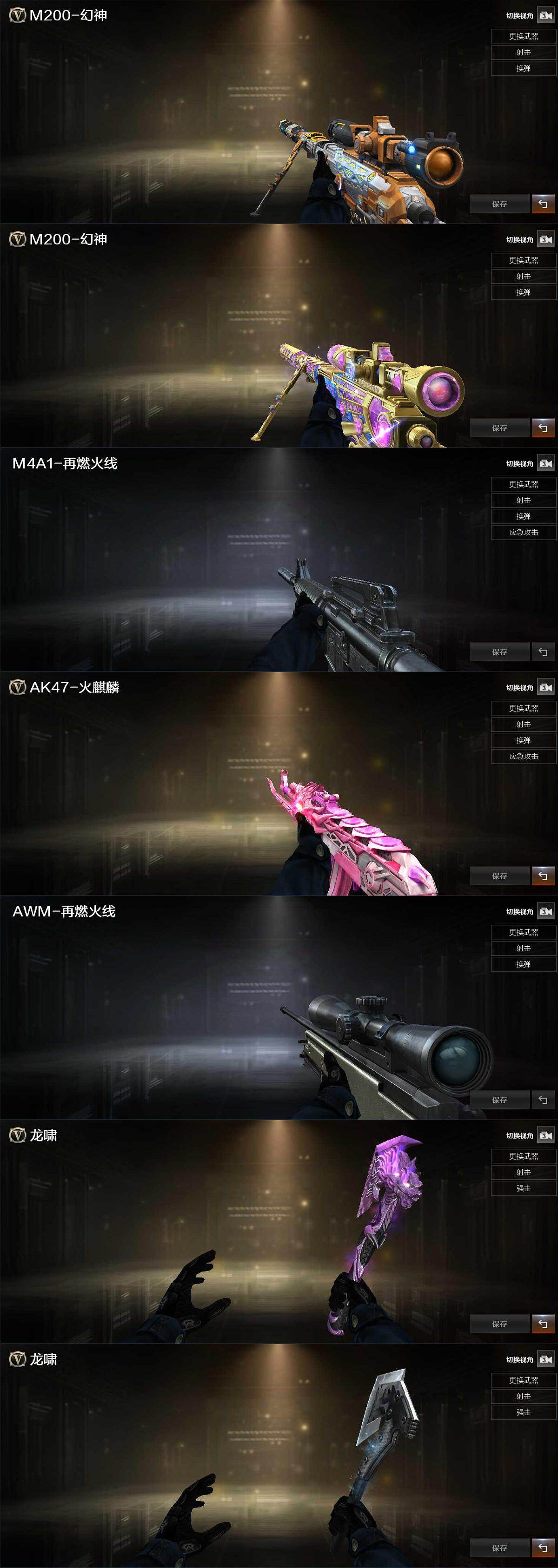 【热门武器】:传说辉光,G36C-幻影,QBZ03-金色蔷薇,M200-幻神,金色蔷薇-古蛇迷踪,修罗-古蛇迷踪,M4A1-黑骑士,汤姆逊-烈龙*5,斯泰尔-蝴蝶