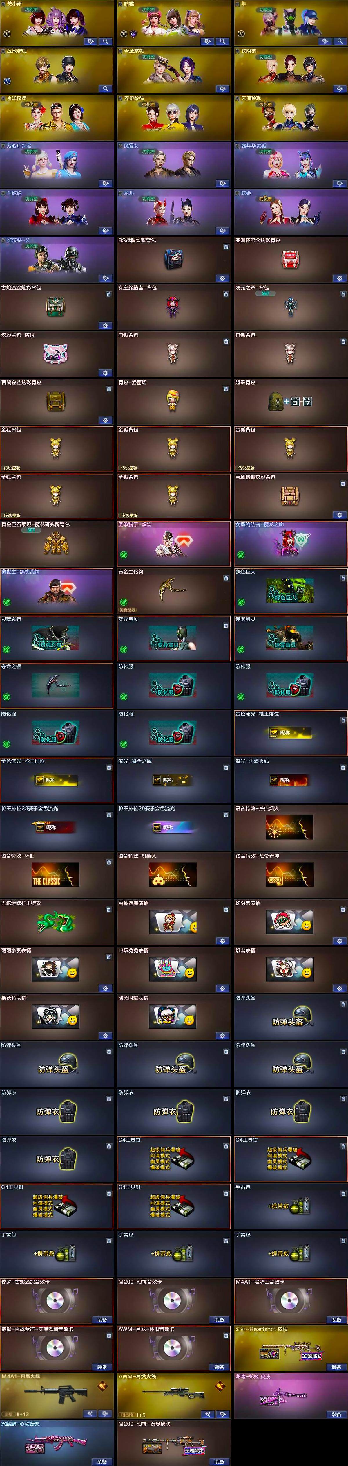 【道具】:BS战队炫彩背包,亚洲杯纪念炫彩背包,古蛇迷踪炫彩背包,女皇终结者-背包,次元之矛-背包,炫彩背包-诺拉,白狐背包*2,百战金芒炫彩背包,背包-洛丽塔,超级背包,金狐背包*5,雪域霜狐炫彩背包,黄金巨石泰坦-魔花研究所背包,圣拳猎手-炽雪,女皇终结者-魔龙之吻,救世主-黑桃战神,黄金生化钩,绿色巨人,灵魂忍者,变异宝贝,迷雾幽灵,夺命之镰,防化服*4,金色流光-枪王排位*2,流光-鎏金之域,流光-再燃火线,枪王