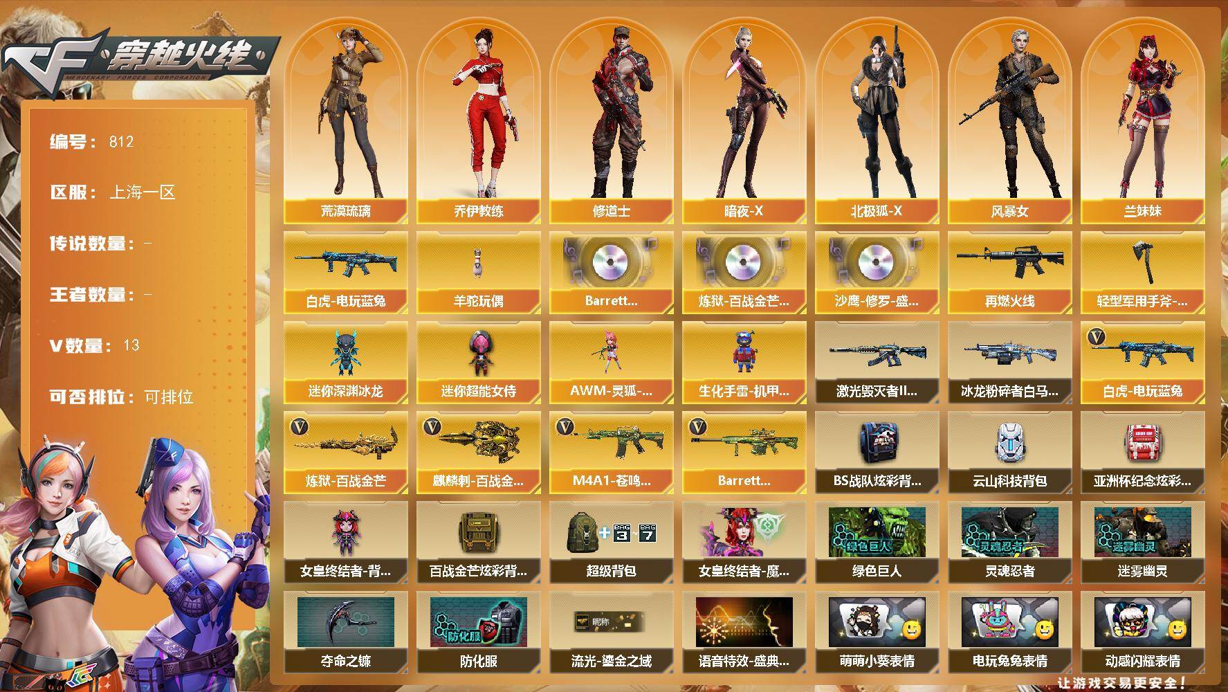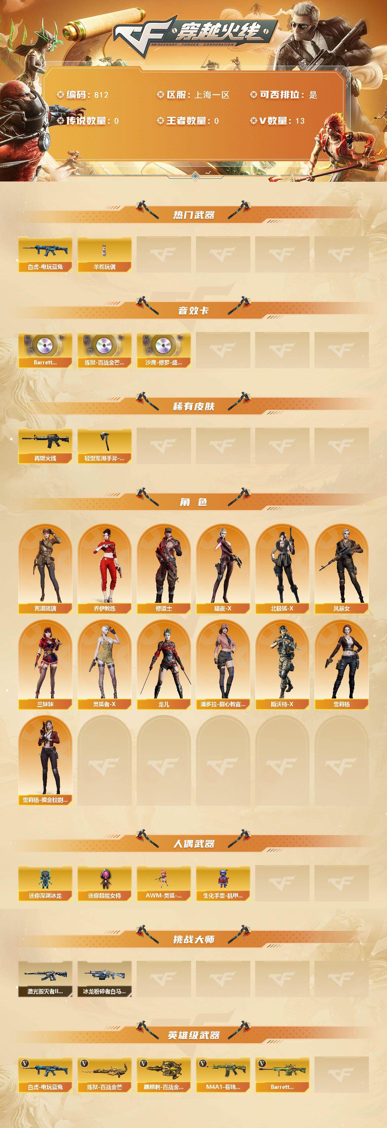 [14392373]上海一区-13V-0王者-0炫金 【热门武器】:白虎-电玩蓝兔,羊驼玩偶 【音效卡】:Barrett-碧霄极光音效卡,炼狱-百战金芒-庆典舞曲音效卡,沙鹰-修罗-盛典舞曲音效卡 【皮肤】:M4A1-再燃火线,轻型军用手斧-再燃火线 【角色】:荒漠琉璃,乔伊教练,修道士,暗夜-X,北极狐-X,风暴女,兰妹妹,灵狐者-X,龙儿,潘多拉-甜心教官,斯沃特-X,雪莉杨,雪莉杨-摸金校尉 【人偶武器】:AWM-灵狐-15周年嘉年华*2,迷你深渊冰龙,生化手雷-机甲核心,迷你超能女侍 【挑战大师】:冰龙粉碎者-白马银枪,激光毁灭者III-白马银枪 【英雄级武器】:白虎-电玩蓝兔,炼狱-百战金芒,麒麟刺-百战金芒,M4A1-苍鸣雷神,Barrett-碧霄极光*2 【道具】:BS战队炫彩背包,云山科技背包,亚洲杯纪念炫彩背包,女皇终结者-背包,百战金芒炫彩背包,超级背包,女皇终结者-魔龙之吻,绿色巨人,灵魂忍者,迷雾幽灵*2,夺命之镰,防化服*3,流光-鎏金之域,语音特效-盛典烟火,萌萌小葵表情,电玩兔兔表情,动感闪耀表情,防弹头盔*3,防弹衣*3,C4工具钳*3,手雷包*3 【特殊枪械】: