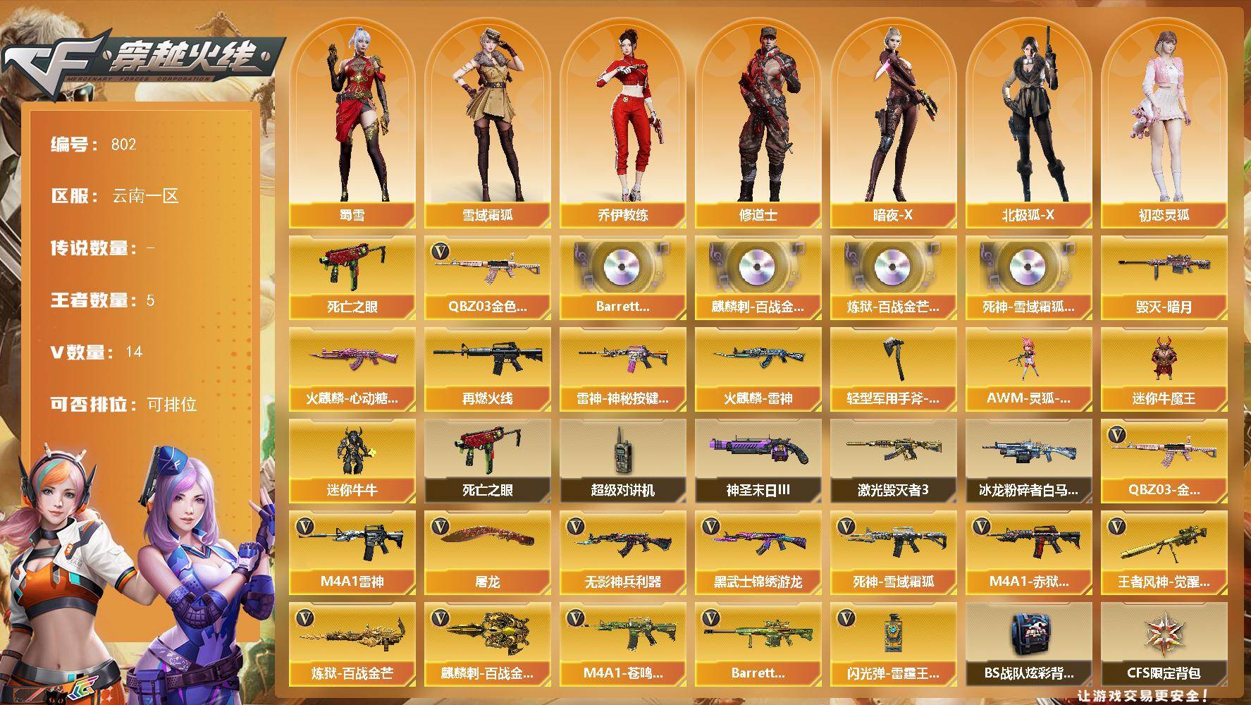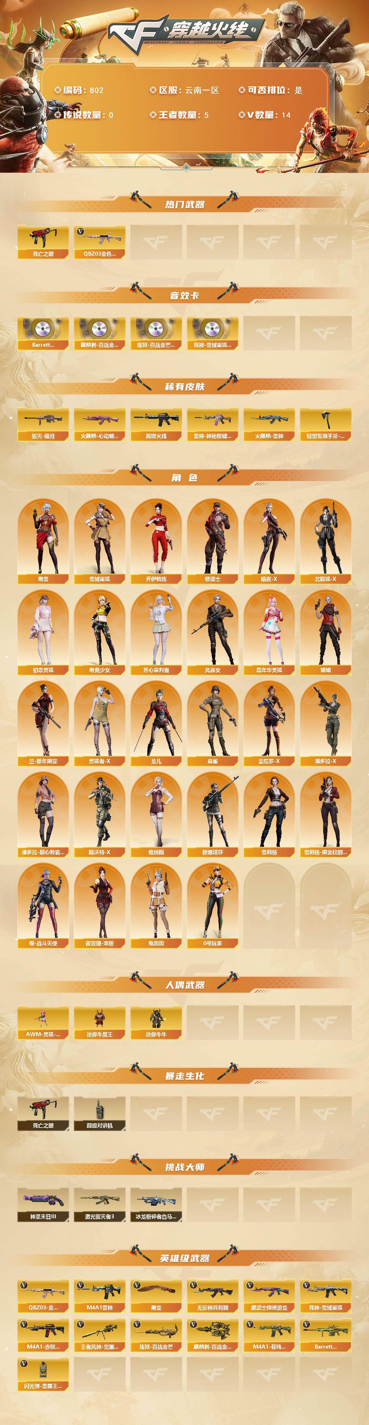 [14392321]云南一区-14V-5王者-0炫金 【热门武器】:QBZ03-金色蔷薇,死亡之眼 【音效卡】:Barrett-碧霄极光音效卡,麒麟刺-百战金芒-盛典舞曲音效卡,炼狱-百战金芒-庆典舞曲音效卡,死神-雪域霜狐-怀旧音效卡 【皮肤】:M4A1-再燃火线,雷神-神秘按键 皮肤,火麒麟-雷神,火麒麟-心动糖果,毁灭-暗月,轻型军用手斧-再燃火线 【角色】:雪域霜狐,乔伊教练,修道士,暗夜-X,北极狐-X,初恋灵狐,电竞少女,芳心审判者,风暴女,嘉年华灵狐,娟娟,兰-新年限定,0号玩家,灵狐者-X,龙儿,麻雀,曼陀罗-X,潘多拉-X,潘多拉-甜心教官,斯沃特-X,蜀雪,兔囡囡,维纳斯,新娜塔莎,雪莉杨,雪莉杨-摸金校尉,夜玫瑰-宠粉,樱-战斗天使 【人偶武器】:AWM-灵狐-15周年嘉年华*2,迷你牛魔王,迷你牛牛 【暴走生化】:死亡之眼,超级对讲机 【挑战大师】:冰龙粉碎者-白马银枪,激光毁灭者III,神圣爆裂者-末日III 【英雄级武器】:M4A1-雷神,无影-神兵利器,黑武士-锦绣游龙,死神-雪域霜狐,QBZ03-金色蔷薇,王者风神-觉醒版,炼狱-百战金芒,屠龙,麒麟刺-百战金芒,闪光弹-雷霆王者-觉醒版,M4A1-赤狱骑士,M4A1-苍鸣雷神,Barrett-碧霄极光 【道具】:BS战队炫彩背包,CFS限定背包,亚洲杯纪念炫彩背包,战舰背包,炫彩背包-诺拉,百战金芒炫彩背包,背包-洛丽塔,超级背包,雪域霜狐炫彩背包,女皇终结者-魔龙之吻,救世主-黑桃战神,绿色巨人,灵魂忍者,迷雾幽灵,夺命之镰,防化服*3,金色流光-枪王排位*2,星辰流光-枪王排位,流光-鎏金之域,枪王排位28赛季金色流光,枪王排位29赛季金色流光,语音特效-盛典烟火,语音特效-怀旧,雪域霜狐表情,萌萌小葵表情,EP战队名片,EP战队喷图,EP战队击杀图标,防弹头盔*4,防弹衣*4,C4工具钳*4,手雷包*4 【特殊枪械】: