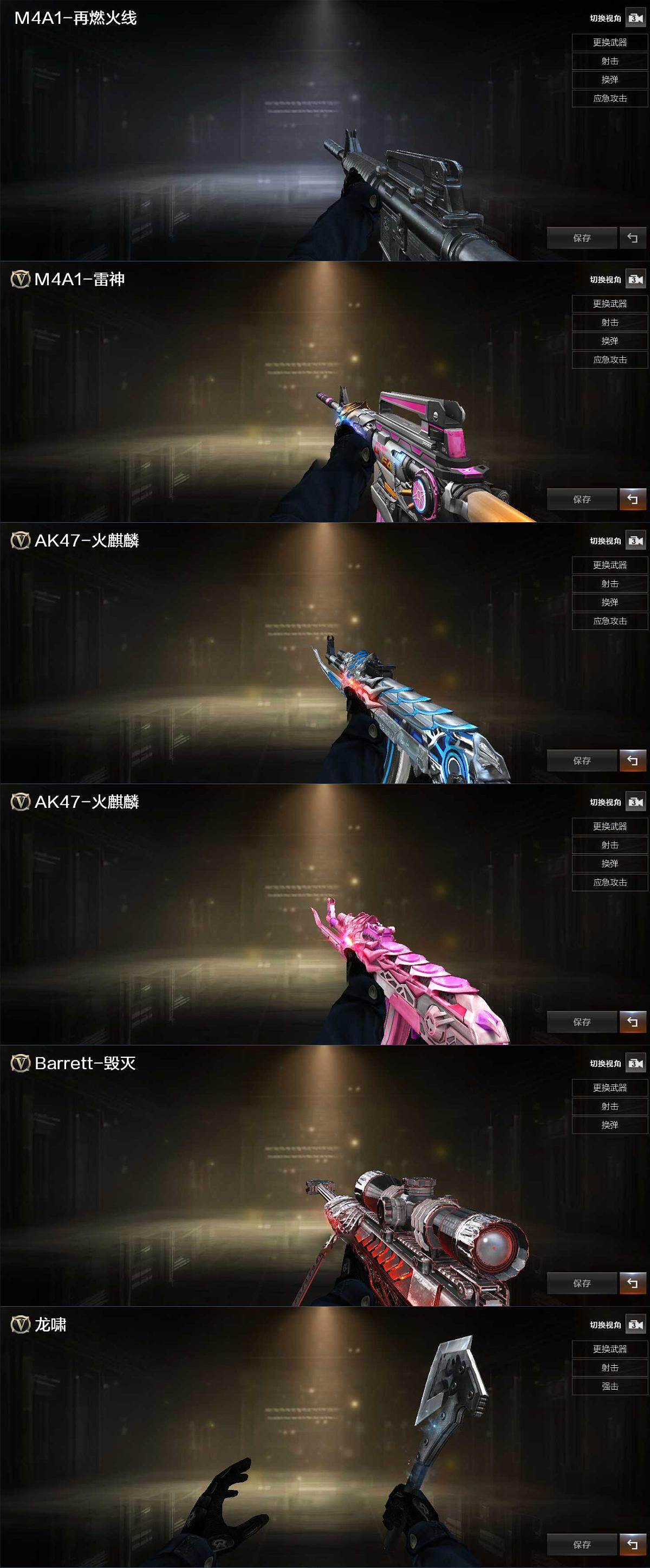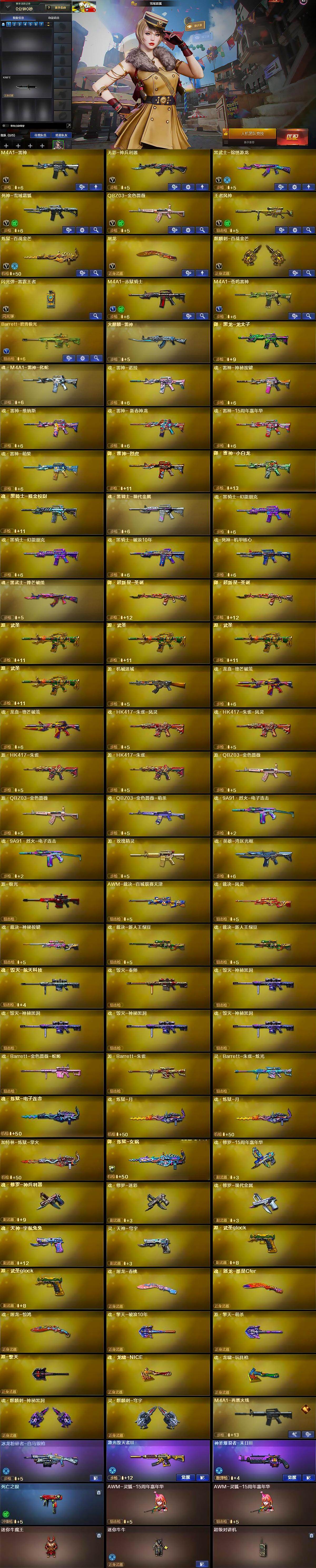 【英雄级武器】:M4A1-雷神,无影-神兵利器,黑武士-锦绣游龙,死神-雪域霜狐,QBZ03-金色蔷薇,王者风神-觉醒版,炼狱-百战金芒,屠龙,麒麟刺-百战金芒,闪光弹-雷霆王者-觉醒版,M4A1-赤狱骑士,M4A1-苍鸣雷神,Barrett-碧霄极光