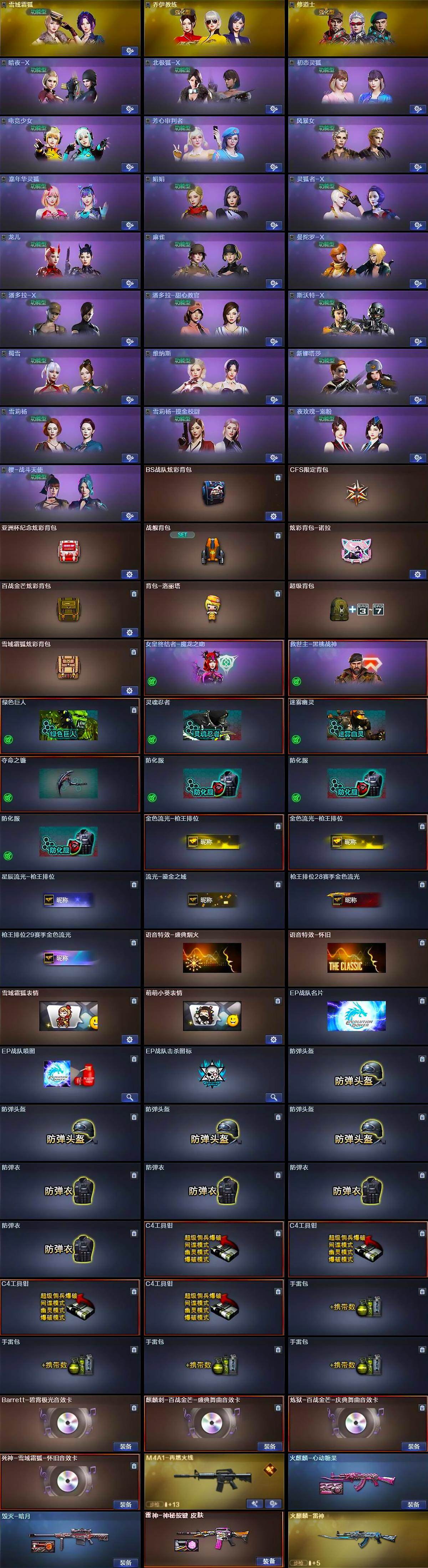 【道具】:BS战队炫彩背包,CFS限定背包,亚洲杯纪念炫彩背包,战舰背包,炫彩背包-诺拉,百战金芒炫彩背包,背包-洛丽塔,超级背包,雪域霜狐炫彩背包,女皇终结者-魔龙之吻,救世主-黑桃战神,绿色巨人,灵魂忍者,迷雾幽灵,夺命之镰,防化服*3,金色流光-枪王排位*2,星辰流光-枪王排位,流光-鎏金之域,枪王排位28赛季金色流光,枪王排位29赛季金色流光,语音特效-盛典烟火,语音特效-怀旧,雪域霜狐表情,萌萌小葵表情,EP战队名片,EP战队喷图,EP战队击杀图标,防弹头盔*4,防弹衣*4,C4工具钳*4,手雷包*4