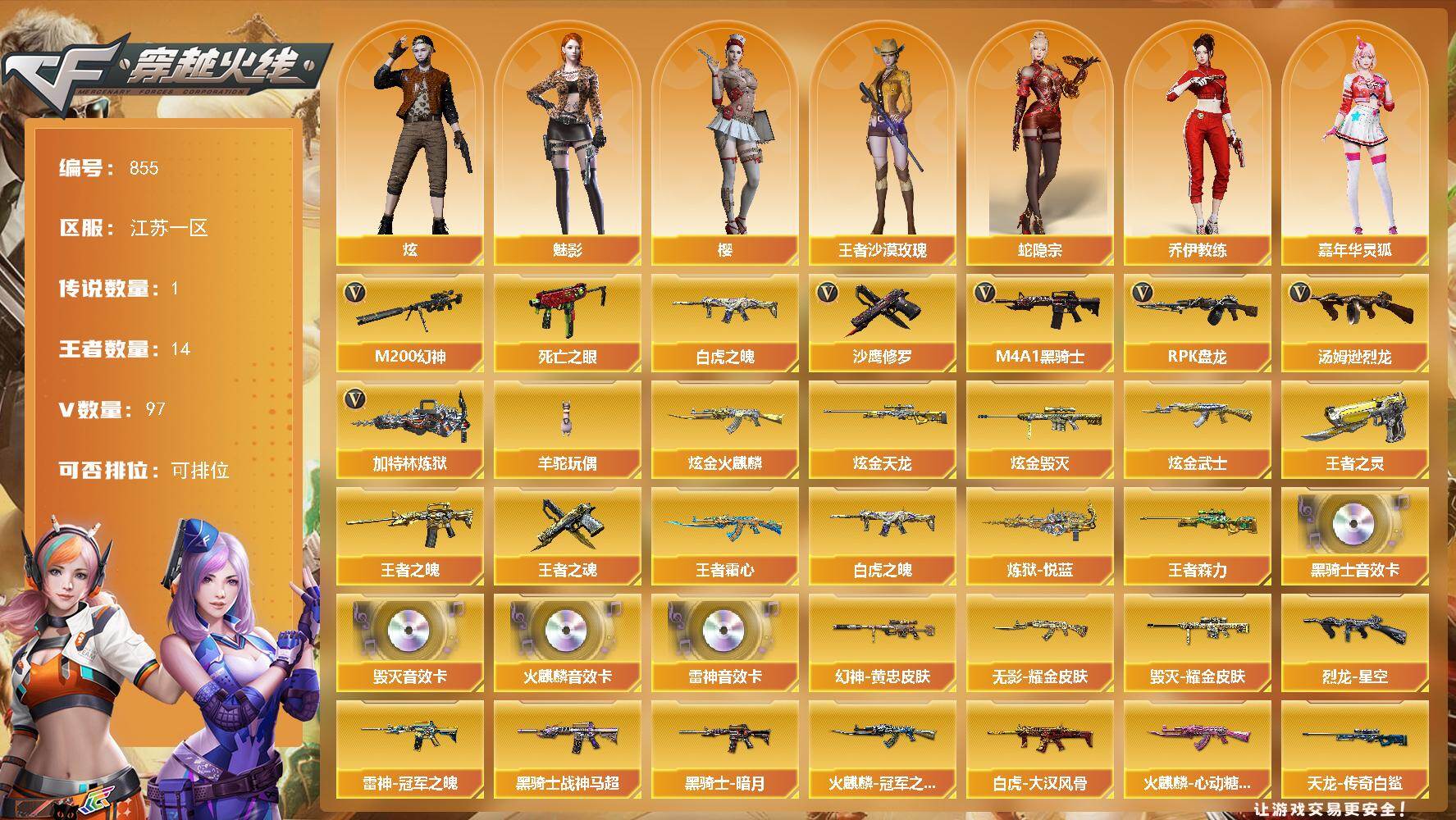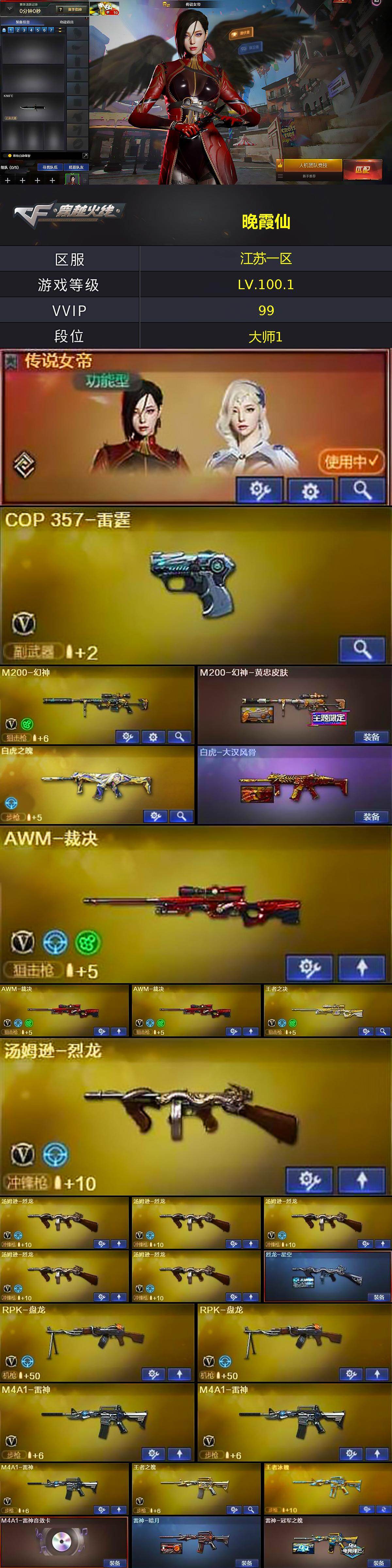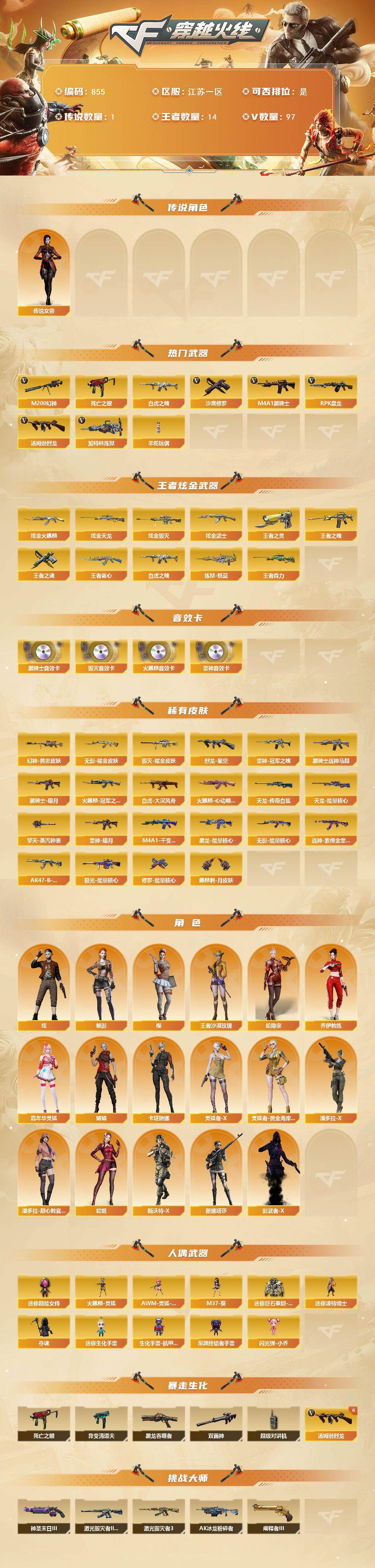[14392962]江苏一区-97V-14王者-4炫金 【传说角色】:传说女帝 【热门武器】:M200-幻神,死亡之眼,白虎之魄,M4A1-黑骑士*2,汤姆逊-烈龙*6,RPK-盘龙*2,加特林-炼狱*2,羊驼玩偶,沙鹰-修罗*6 【王者炫金武器】:王者之魄,王者霜心,白虎之魄,王者森力,炼狱-悦蓝*2,王者之灵,王者之魂,炫金火麒麟,炫金武士,炫金毁灭,炫金天龙 【音效卡】:AK47-火麒麟音效卡,M4A1-雷神音效卡,M4A1-黑骑士音效卡,Barrett-毁灭音效卡 【皮肤】:M200-幻神-黄忠皮肤,白虎-大汉风骨,烈龙-星空,雷神-暗月,雷神-冠军之魄,火麒麟-冠军之心,火麒麟-心动糖果,毁灭耀金皮肤*2,M4A1-千变-孔明皮肤,黑龙-能量核心,黑骑士-暗月,黑骑士-战神马超,无影-能量核心,无影耀金皮肤,战神-紫绶金章皮肤,AK47-B-常胜将军-刘备,天龙-能量核心,AWM-天龙-传奇白鲨,极光-能量核心,修罗-能量核心,擎天-蒸汽钟表 皮肤,麒麟刺-月皮肤 【角色】:樱,魅影,炫,王者沙漠玫瑰,蛇隐宗,乔伊教练,嘉年华灵狐,娟娟,卡塔琳娜,灵狐者-X,灵狐者-黄金海岸,潘多拉-X,潘多拉-甜心教官,蛇姬,斯沃特-X,新娜塔莎,影武者-X 【人偶武器】:火麒麟-灵狐*2,AWM-灵狐-15周年嘉年华,M37-葵,迷你波特博士,夺魂,迷你生化手雷,生化手雷-机甲核心*3,深渊终结者手雷,闪光弹-小乔,迷你超能女侍,迷你巨石泰坦-魔花研究所 【暴走生化】:异变清道夫,黑龙吞噬者,双面神*2,死亡之眼,超级对讲机 【挑战大师】:AK47-冰龙粉碎者,激光毁灭者III-白马银枪,激光毁灭者III,神圣爆裂者-末日III,阐释者III 【英雄级武器】:M4A1-千变,AK47-火麒麟*3,M4A1-黑龙,M4A1-雷神*3,M4A1-黑骑士*2,AK47-无影,AK47-黑武士,AN94-超新星*2,AK47-黑鲨*3,无影-神兵利器,烈火-动感闪耀,王者之心-觉醒版,王者之魄-觉醒版,王者之幻-觉醒版,AK-47-猩红传说*8,AK47-B-战神*2,AWM-天龙,Barrett-毁灭*3,AWM-裁决*3,M200-幻神,王者之决-觉醒版,RPK-盘龙*2,加特林-炼狱*2,汤姆逊-烈龙*6,AA-12-雷霆*2,沙鹰-修罗*6,沙鹰-天神,COP-雷霆,天神-动感闪耀,屠