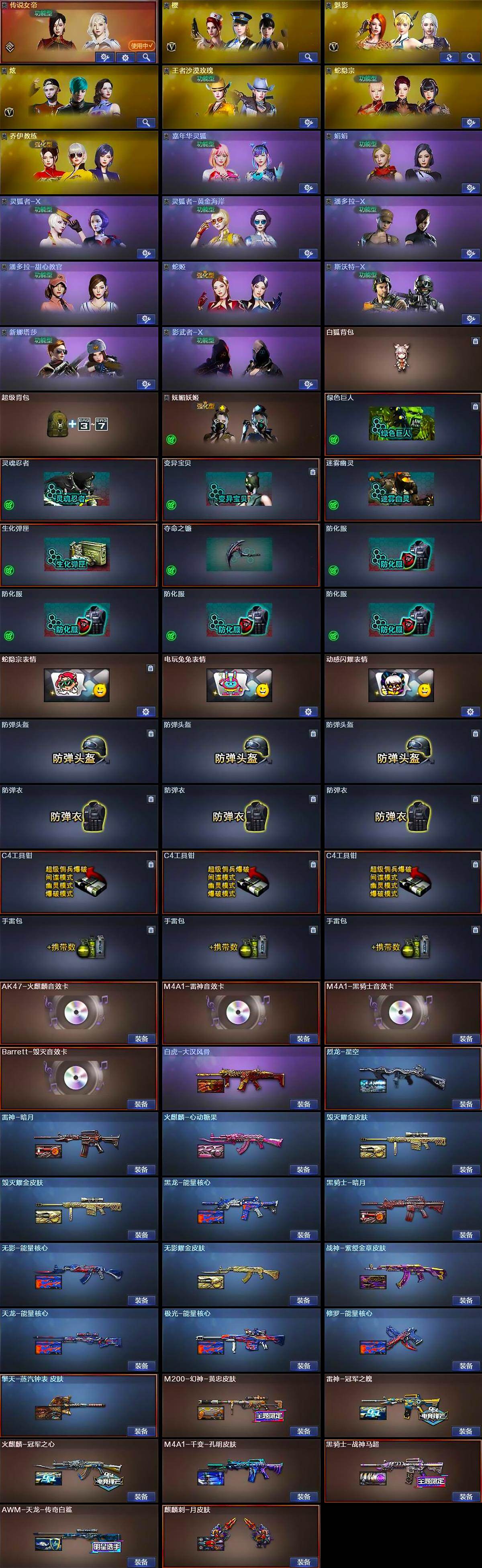【皮肤】:M200-幻神-黄忠皮肤,白虎-大汉风骨,烈龙-星空,雷神-暗月,雷神-冠军之魄,火麒麟-冠军之心,火麒麟-心动糖果,毁灭耀金皮肤*2,M4A1-千变-孔明皮肤,黑龙-能量核心,黑骑士-暗月,黑骑士-战神马超,无影-能量核心,无影耀金皮肤,战神-紫绶金章皮肤,AK47-B-常胜将军-刘备,天龙-能量核心,AWM-天龙-传奇白鲨,极光-能量核心,修罗-能量核心,擎天-蒸汽钟表 皮肤,麒麟刺-月皮肤
