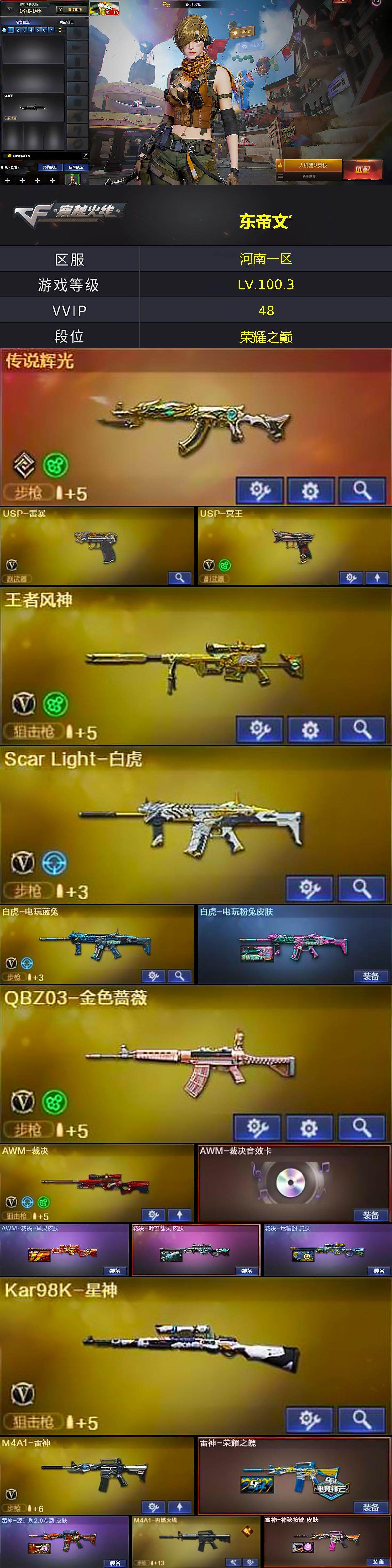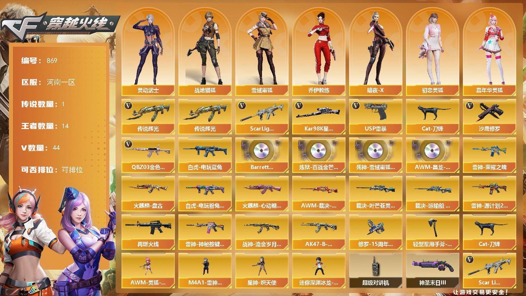 [14393119]河南一区-44V-14王者-0炫金 【传说武器】:传说辉光 【热门武器】:传说辉光,QBZ03-金色蔷薇,Scar Light-白虎,白虎-电玩蓝兔,Kar98K-星神,Cat-刀锋,USP-雷暴,沙鹰-修罗*2 【音效卡】:Barrett-碧霄极光音效卡,炼狱-百战金芒-庆典舞曲音效卡,死神-雪域霜狐-怀旧音效卡,AWM-昌龙-怀旧音效卡 【皮肤】:白虎-电玩粉兔皮肤,AWM-裁决-凤灵皮肤,裁决-叶芒苍灵 皮肤,裁决-运输船 皮肤,雷神-荣耀之魄,雷神-源计划2.0专属 皮肤,M4A1-再燃火线,雷神-神秘按键 皮肤,火麒麟-盘古,火麒麟-心动糖果,战神-流金岁月皮肤,AK47-B-常胜将军-刘备,修罗-15周年嘉年华 皮肤,轻型军用手斧-再燃火线 【角色】:战地猎狐,雪域霜狐,乔伊教练,暗夜-X,初恋灵狐,嘉年华灵狐,兰-新年限定,兰妹妹,灵动武士,灵狐者-X,曼陀罗-X,潘多拉-X,蛇姬,斯沃特-X,兔囡囡,雪莉杨-摸金校尉,游珑儿 【人偶武器】:星神-炽天使,M4A1-雷神-精英刀锋,AWM-灵狐-15周年嘉年华,Cat-刀锋,迷你深渊冰龙-王绿豆 【暴走生化】:超级对讲机 【挑战大师】:神圣爆裂者-末日III 【英雄级武器】:AK47-火麒麟*2,M4A1-黑龙,M4A1-雷神,AK47-黑鲨,Scar Light-白虎,无影-神兵利器,黑武士-锦绣游龙,QBZ03-独角-III,QBZ03-金色蔷薇,烈火-动感闪耀,白虎-电玩蓝兔,AWM-天龙,AWM-裁决,Kar98K-星神,王者风神-觉醒版,炼狱-百战金芒,沙鹰-修罗*2,USP-雷暴,USP-冥王,天神-动感闪耀,屠龙,马来剑-夜魔,屠龙-动感闪耀,麒麟刺-百战金芒,高爆手雷-雷暴,高爆手雷-夜魔,高爆手雷-神工天巧,手雷-动感闪耀,闪光弹-雷暴,闪光弹-夜魔,闪光弹-幻灵,闪光弹-雷霆王者-觉醒版*7,烟雾弹-夜魔,烟雾弹-神工天巧,烟雾弹-玄豹,烟雾弹-荣耀世冠EP*3,M4A1-赤狱骑士,Barrett-碧霄极光 【道具】:BS战队炫彩背包,CFPL炫彩背包,CFS限定背包,云山科技背包,亚洲杯纪念炫彩背包,全能枪王背包,古蛇迷踪炫彩背包,女皇终结者-背包,炫彩背包-诺拉,炫彩背包,百战金芒炫彩背包,超级背包,黄金超能特工背包,黑桃战神背包,哔哩哔哩名片,女皇终结者-魔龙之吻,救世主-黑