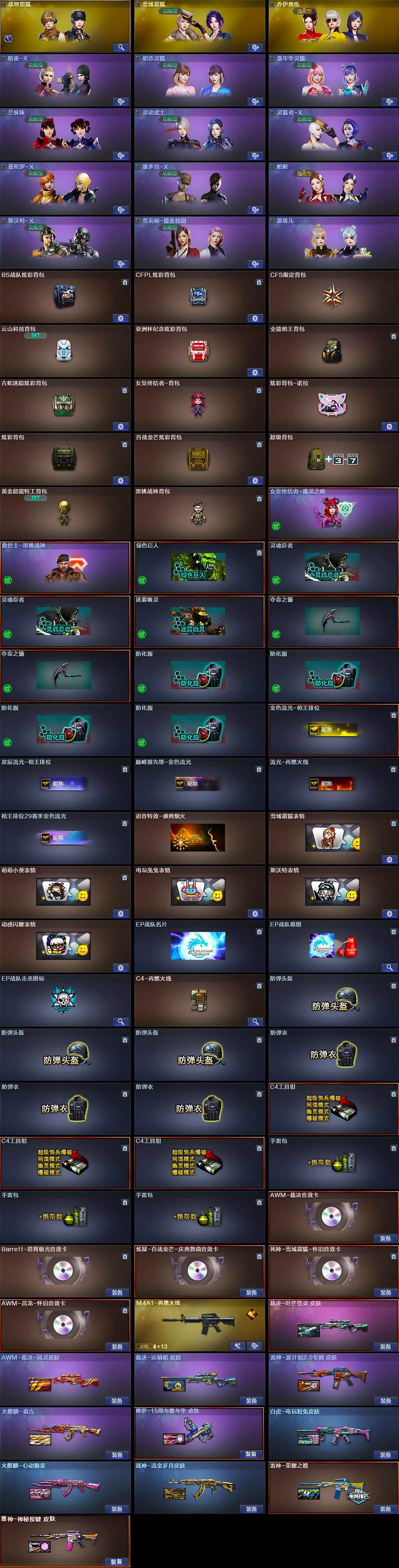 【道具】:BS战队炫彩背包,CFPL炫彩背包,CFS限定背包,云山科技背包,亚洲杯纪念炫彩背包,全能枪王背包,古蛇迷踪炫彩背包,女皇终结者-背包,炫彩背包-诺拉,炫彩背包,百战金芒炫彩背包,超级背包,黄金超能特工背包,黑桃战神背包,哔哩哔哩名片,女皇终结者-魔龙之吻,救世主-黑