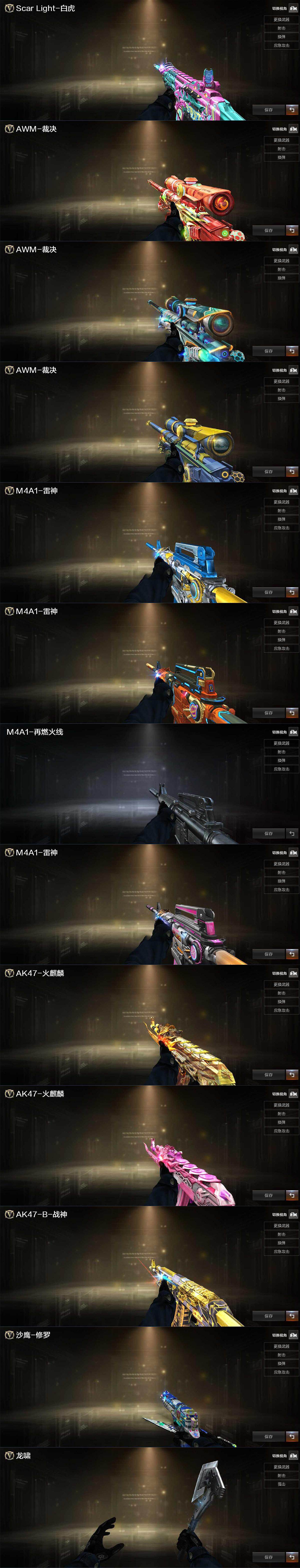 【热门武器】:传说辉光,QBZ03-金色蔷薇,Scar Light-白虎,白虎-电玩蓝兔,Kar98K-星神,Cat-刀锋,USP-雷暴,沙鹰-修罗*2