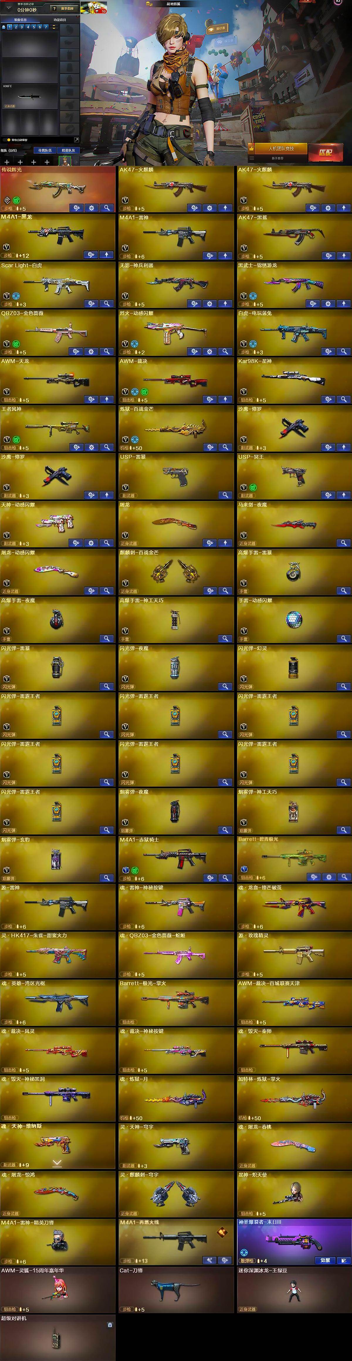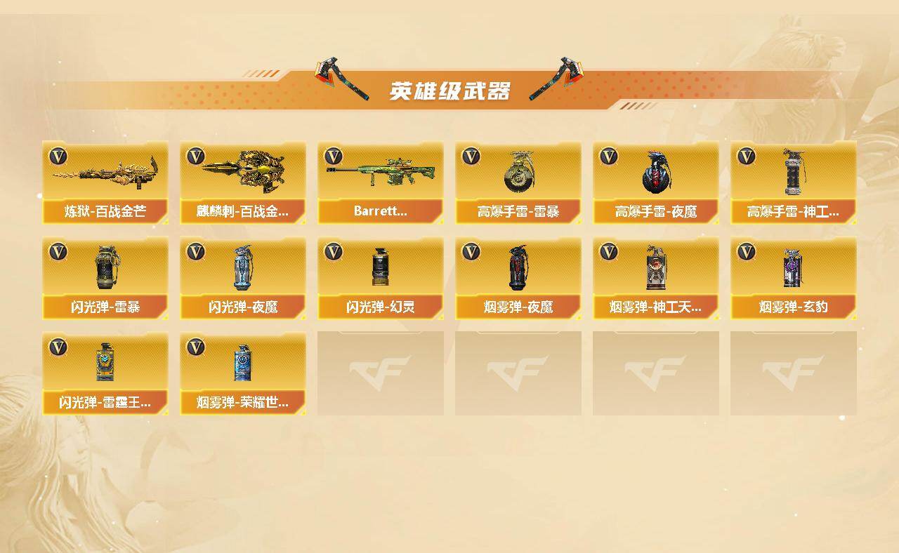 【英雄级武器】:AK47-火麒麟*2,M4A1-黑龙,M4A1-雷神,AK47-黑鲨,Scar Light-白虎,无影-神兵利器,黑武士-锦绣游龙,QBZ03-独角-III,QBZ03-金色蔷薇,烈火-动感闪耀,白虎-电玩蓝兔,AWM-天龙,AWM-裁决,Kar98K-星神,王者风神-觉醒版,炼狱-百战金芒,沙鹰-修罗*2,USP-雷暴,USP-冥王,天神-动感闪耀,屠龙,马来剑-夜魔,屠龙-动感闪耀,麒麟刺-百战金芒,高爆手雷-雷暴,高爆手雷-夜魔,高爆手雷-神工天巧,手雷-动感闪耀,闪光弹-雷暴,闪光弹-夜魔,闪光弹-幻灵,闪光弹-雷霆王者-觉醒版*7,烟雾弹-夜魔,烟雾弹-神工天巧,烟雾弹-玄豹,烟雾弹-荣耀世冠EP*3,M4A1-赤狱骑士,Barrett-碧霄极光